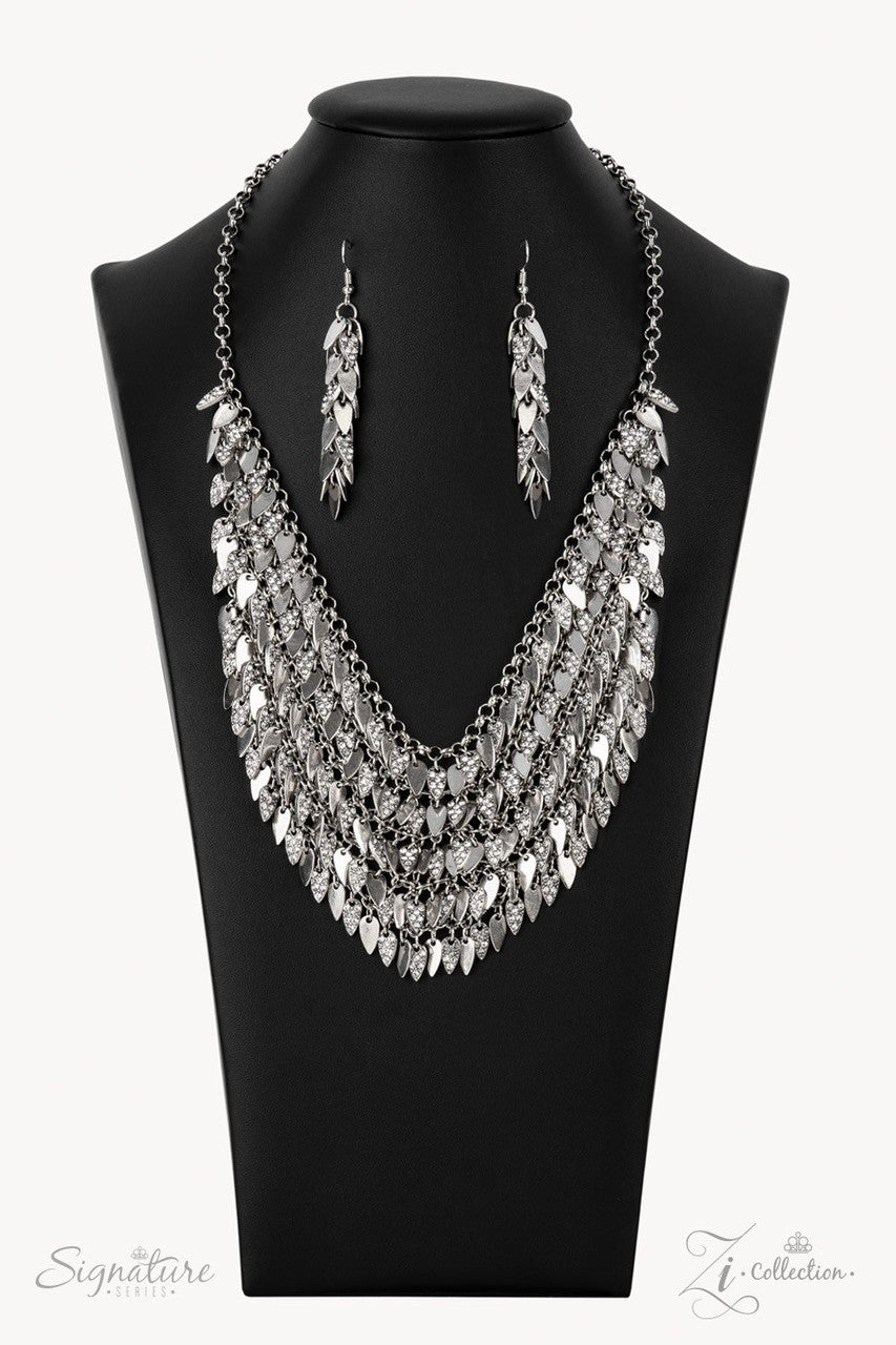 Enhanced with edgy sharpened tips, a seemingly infinite display of plain silver and white rhinestone encrusted teardrop discs dauntlessly drips from an interconnected backdrop of sleek silver links. The ferocious display of alternating dazzle fearlessly dances to its own beat, creating a flirtatiously fierce fringe below the collar. Features an adjustable clasp closure.