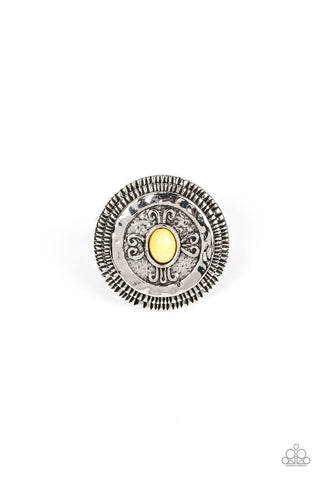 All Things Must COMPASS - Yellow - Beaded Center Silver Filigree Paparazzi Ring