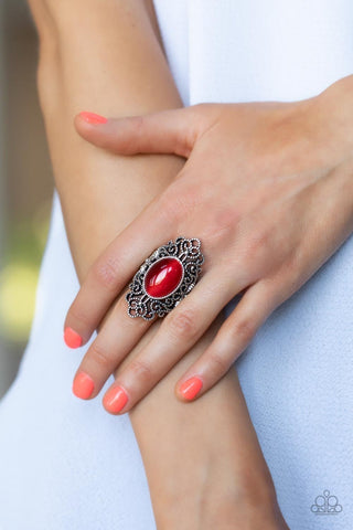 Once Upon a Meadow - Red - Oval Cat's Eye Stone Silver Filigree Paparazzi Ring