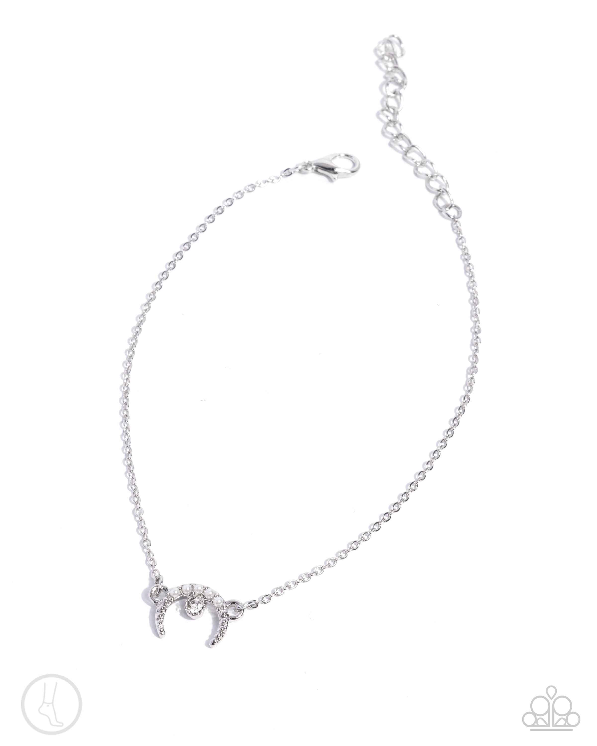 Connected along the center of a dainty silver chain, a silver-studded and pearl-embellished silver upside-down horseshoe is featured along the ankle. A solitaire white rhinestone glitters atop the center of the horseshoe for additional sparkle. Features an adjustable clasp closure.