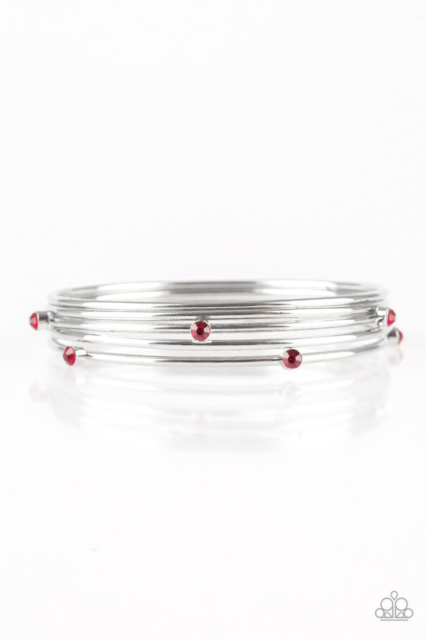 Three shiny silver and two red rhinestone encrusted bangles stack across the wrist for a refined look.