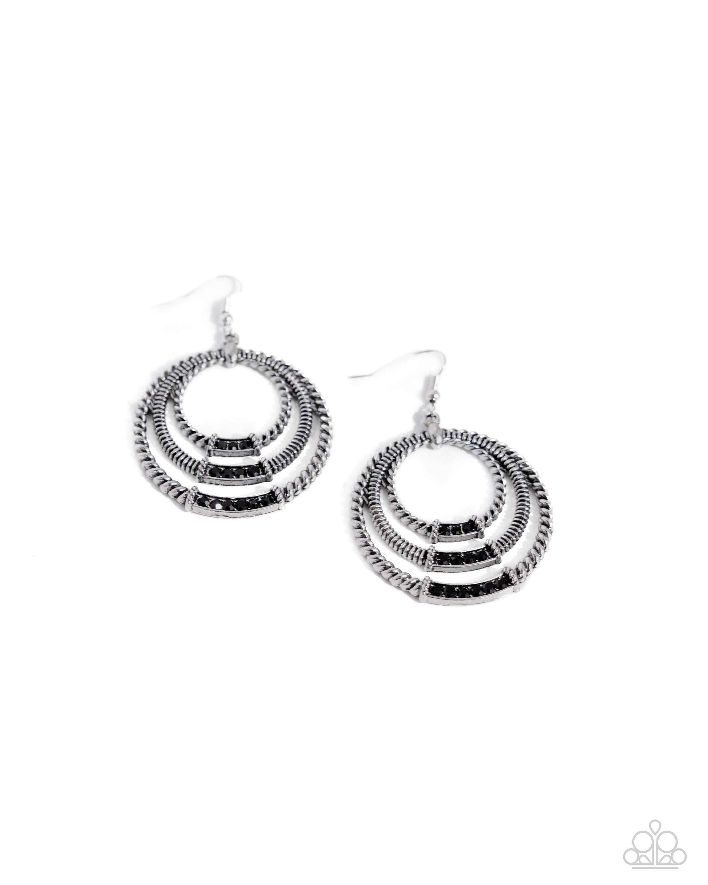 Increasing rows of black rhinestones adorn the centers of a mismatched trio of twisted silver hoops, rippling into a gritty and dizzying display of dazzle. Earring attaches to a standard fishhook fitting.