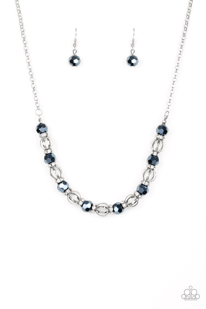 A collection of airy silver beads, faceted blue metallic beads, and white rhinestone encrusted rings are threaded along an invisible wire below the collar for a statement-making fashion. Features an adjustable clasp closure.