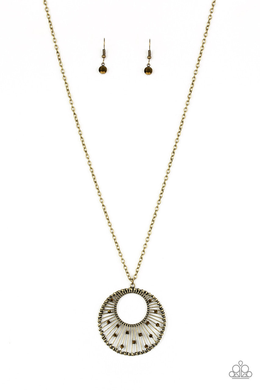 Dainty aurum rhinestones are sprinkled across a round brass frame radiating with linear patterns. The air pendant swings from the bottom of a lengthened brass chain for an edgy look. Features an adjustable clasp closure.
