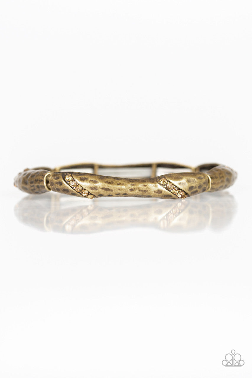 Encrusted in ribbons of golden topaz rhinestones, hammered brass frames are threaded along a stretchy band around the wrist for a refined look.
