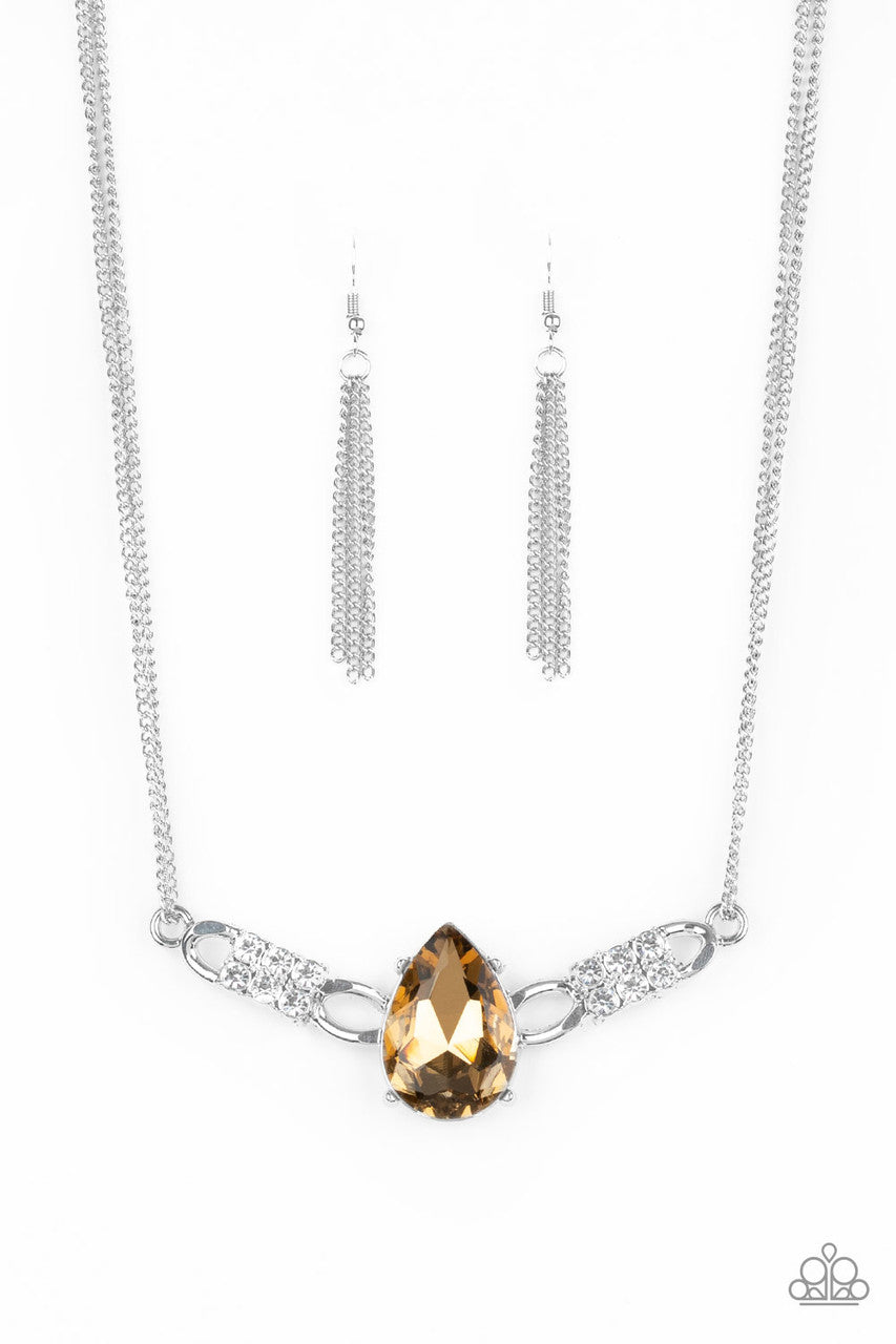 Cut into an alluring teardrop, an oversized topaz rhinestone gem attaches to bold silver frames radiating with glassy white rhinestones. The dramatic pendant attaches to doubled silver chains, swinging horizontally below the collar in a glamorous fashion. Features an adjustable clasp closure.