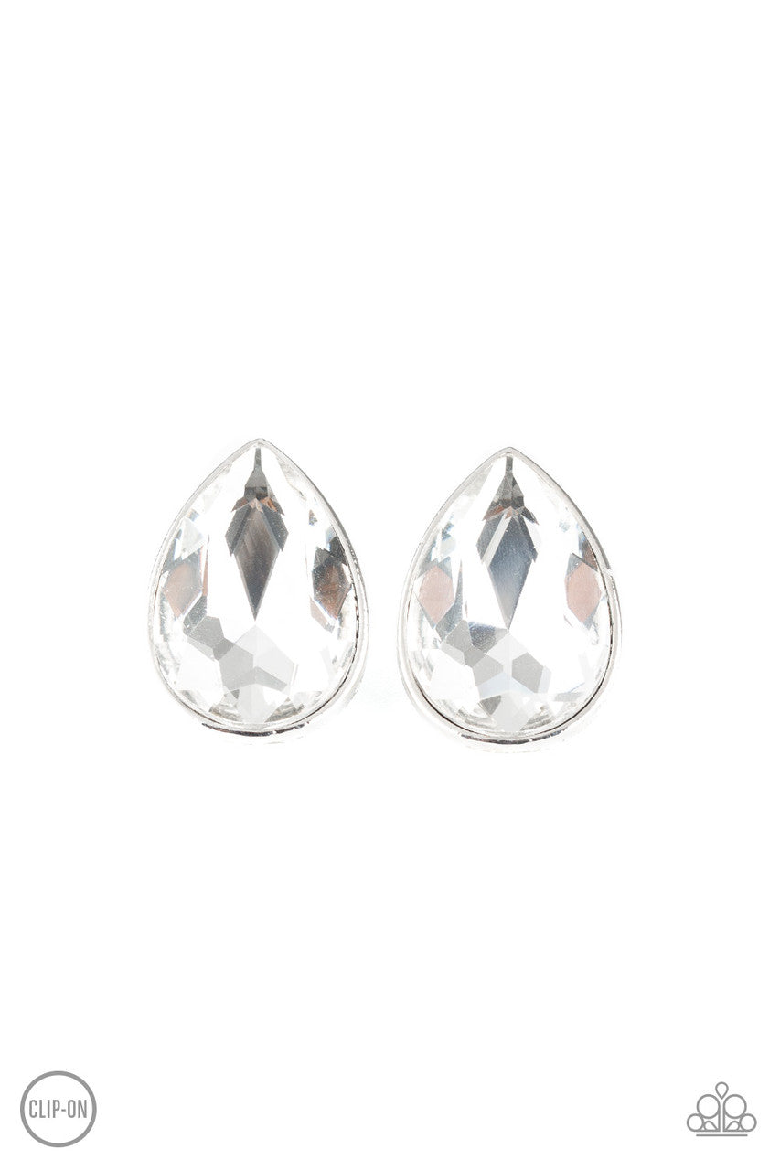 A dramatically oversized white teardrop rhinestone is pressed into a sleek silver frame for a show-stopping glam. Earring attaches to a standard clip-on fitting.