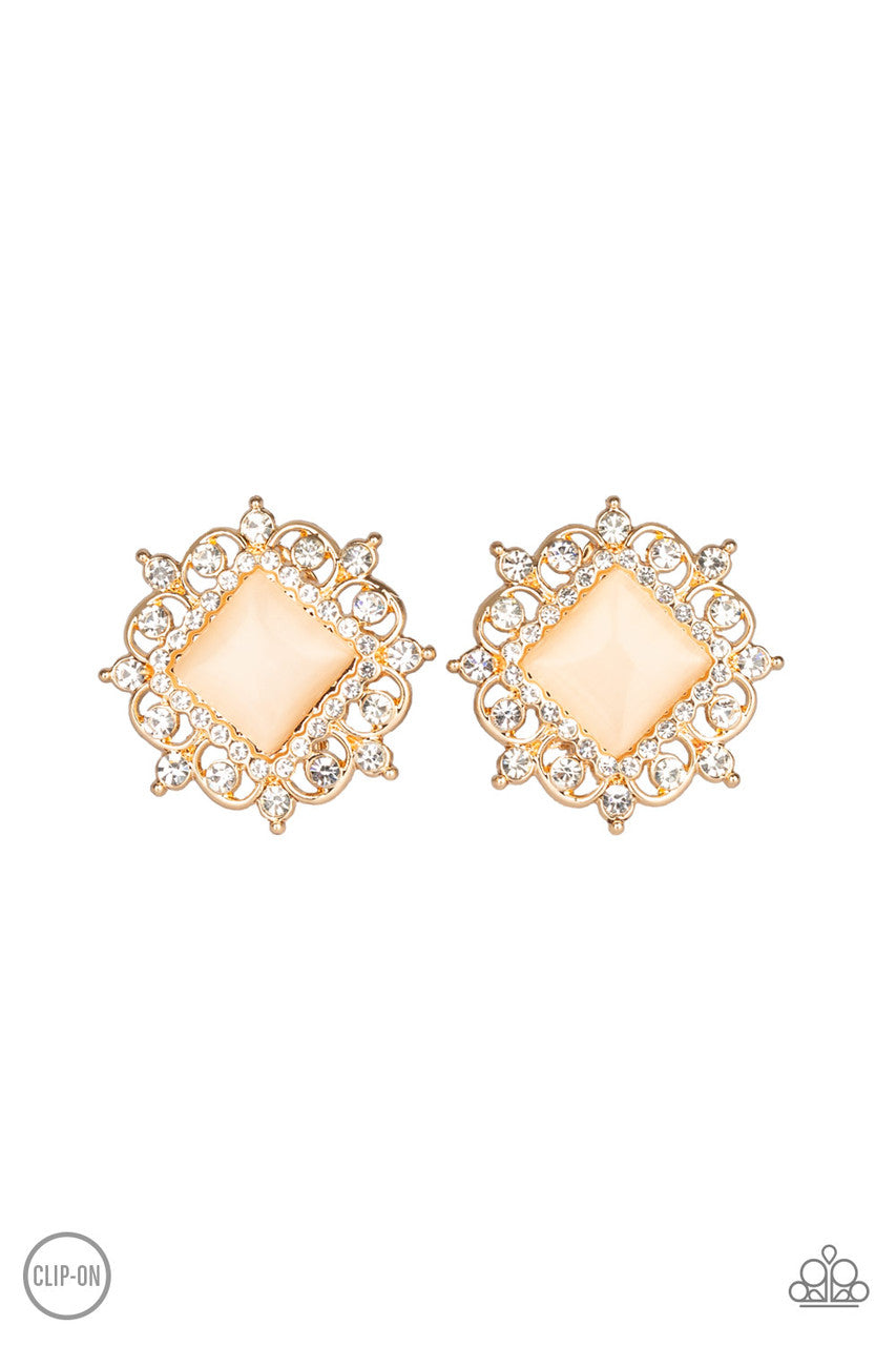 Featuring a regal square cut, a glowing peach moonstone is pressed into the center of an ornate gold frame radiating with glassy white rhinestones for a timeless look. Earring attaches to a standard clip-on fitting.