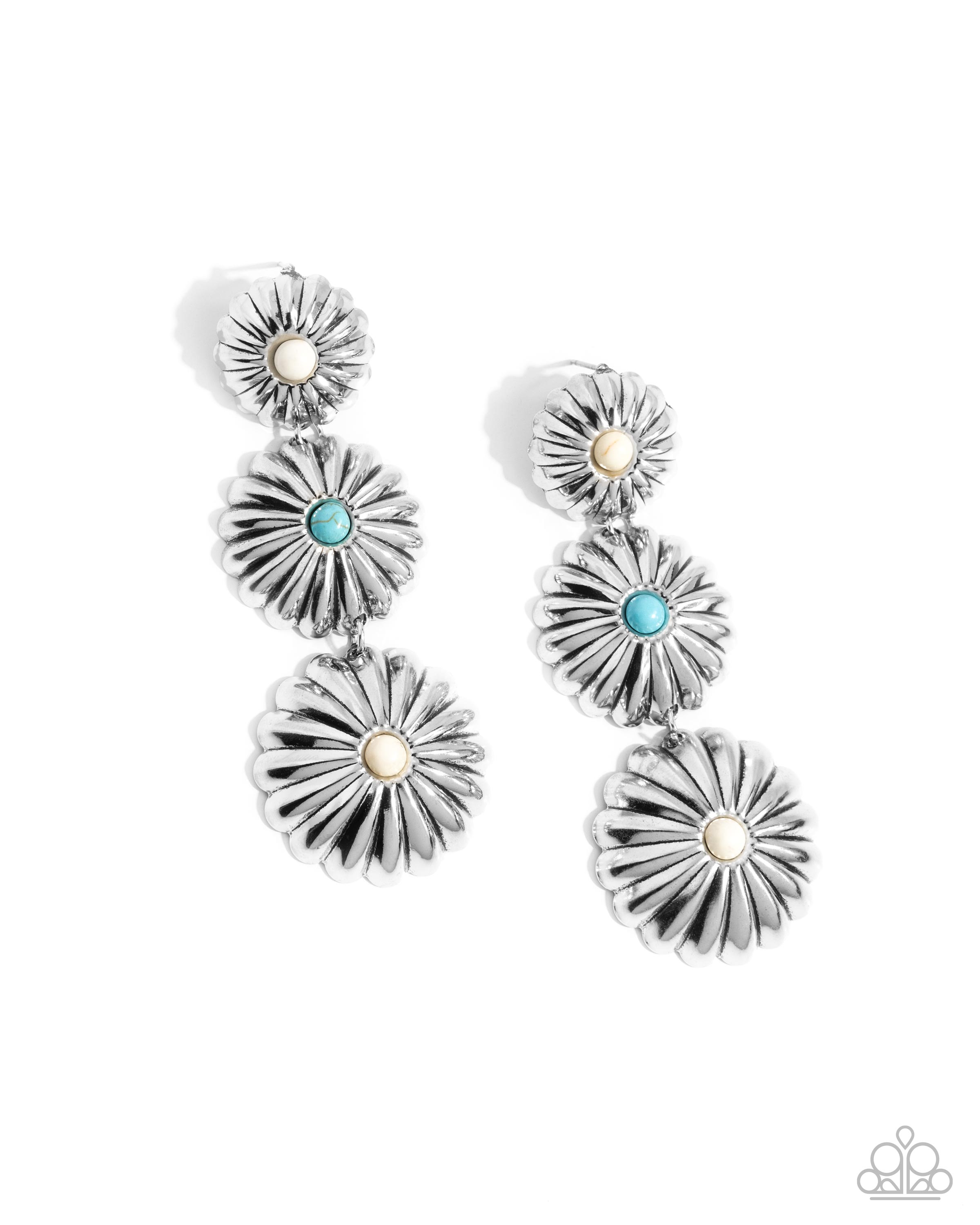 Refreshing turquoise and white stone accents are pressed into circular silver frames embossed in radiating floral-inspired textures, cascading below the ear for a seasonal finish. Earring attaches to a standard post fitting. As the stone elements in this piece are natural, some color variation is normal.
