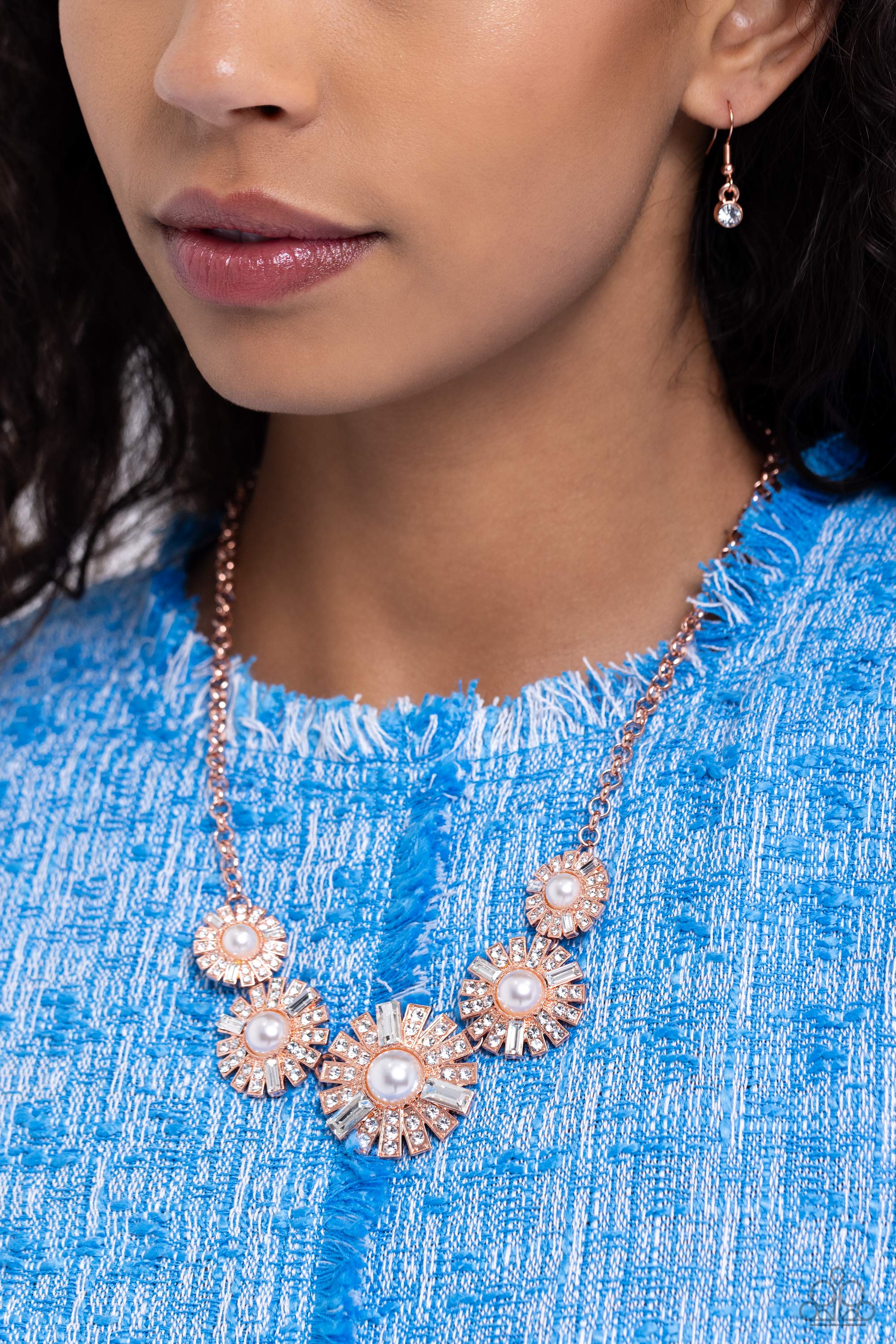 Sleek shiny copper metal bars flare out from a mesmerizing pearl center, creating a stacked rhinestone-encrusted fringe of fanning frames. A trio of emerald-cut white gem bars are sprinkled across each dazzling display for a sassy finish. Features an adjustable clasp closure.