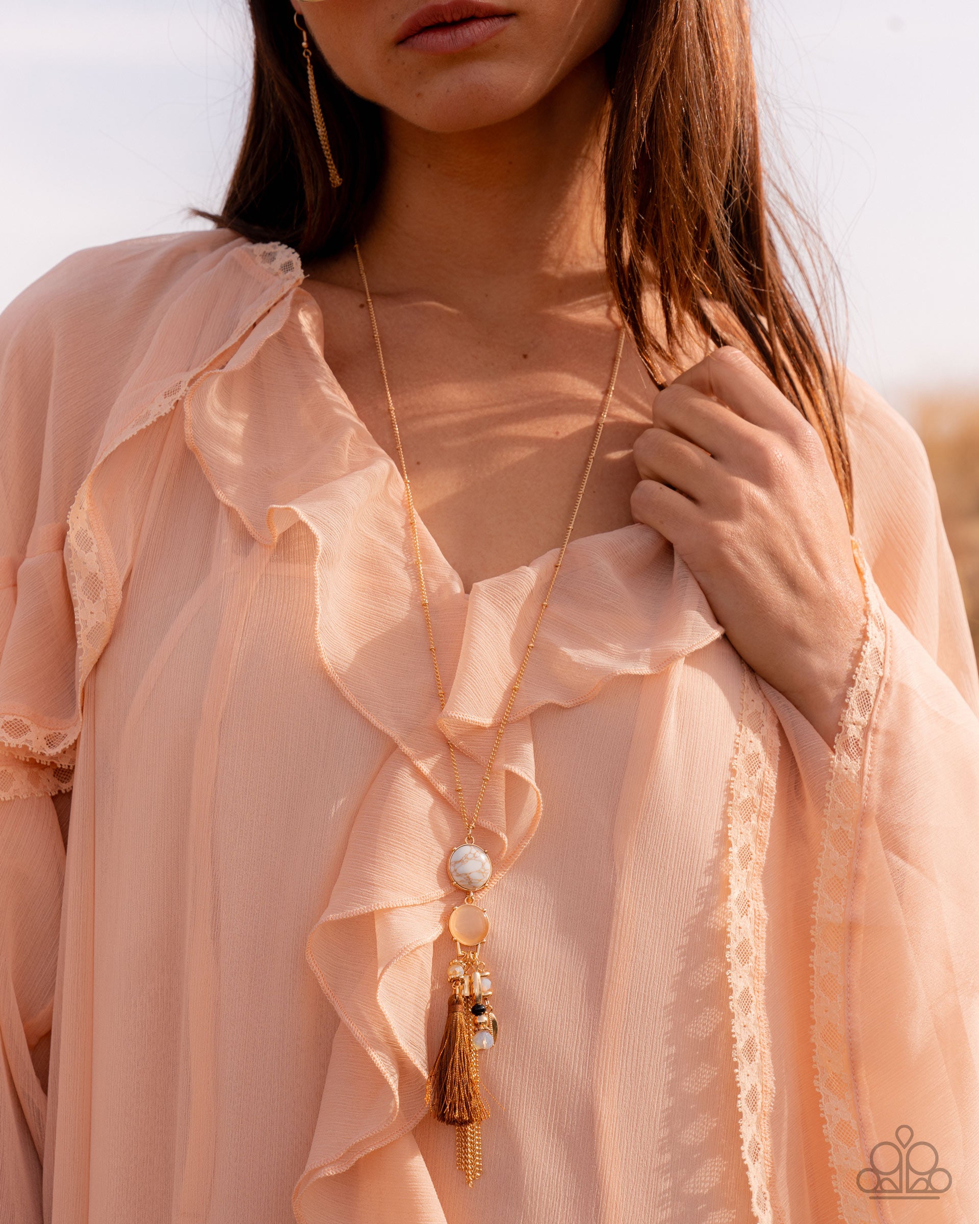 Pronged in gold fittings, a round white stone gives way to a light brown cat's eye stone, finally giving way to a gold-chained tassel, UV shimmery beads, a round black bead, gold wheel beads, a studded leaf-inspired disc, and a Buckthorn Brown threaded tassel below an extended gold satellite chain for an upscale, unique display. Features an adjustable clasp closure. As the stone elements in this piece are natural, some color variation is normal.