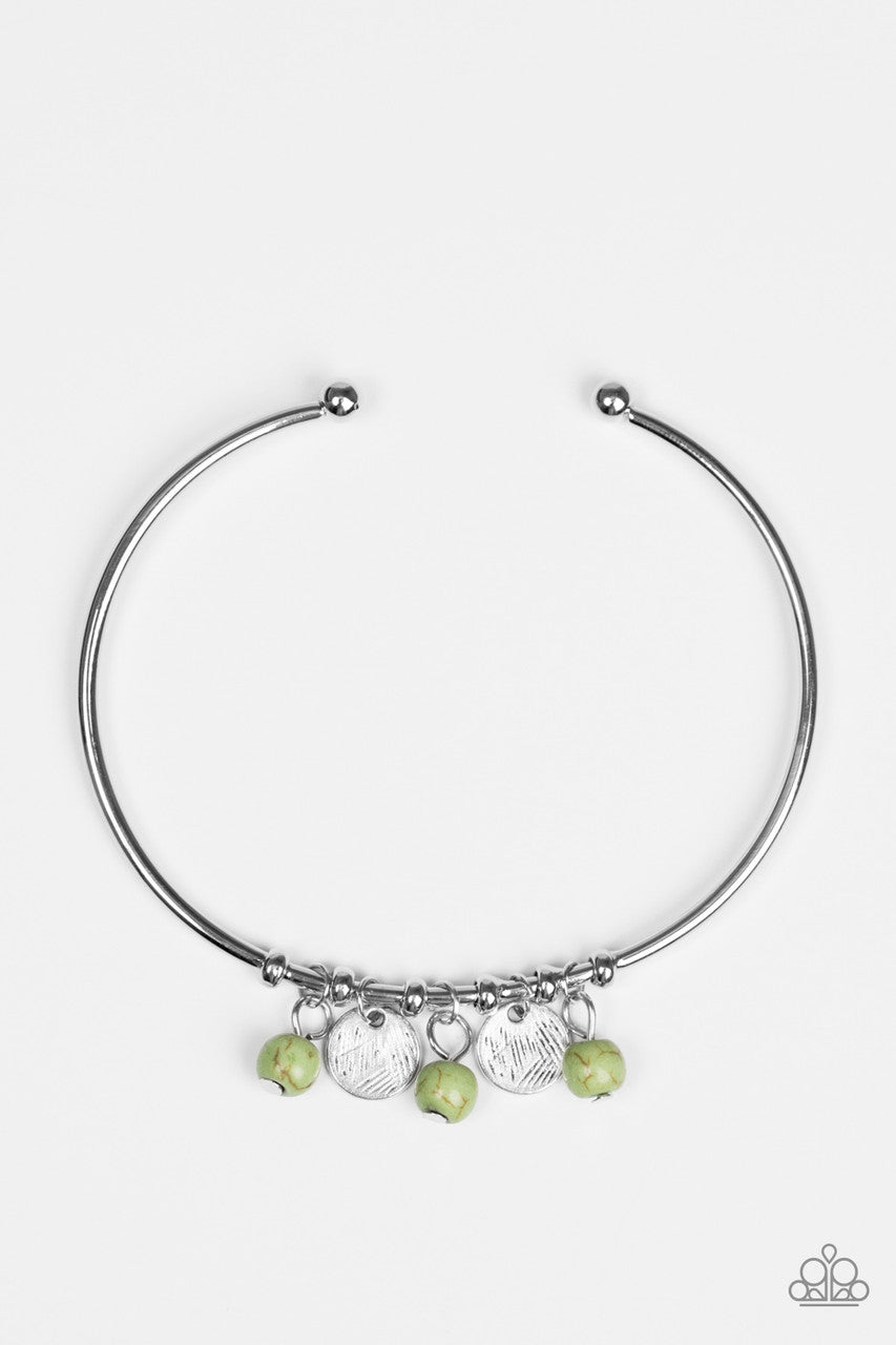 Infused with silver fittings, refreshing green stones swing from a skinny silver bangle. Etched in serrated shimmer, a glistening silver disc swings from the wrist for a seasonal finish.