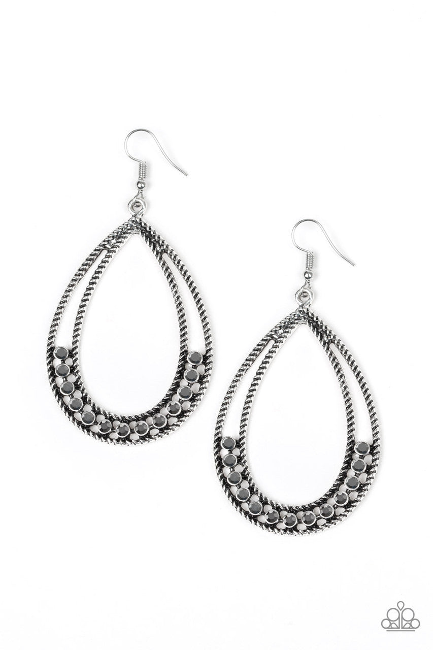 Glittery hematite rhinestones collect at the bottom of an ornate silver teardrop for an edgy look. Earring attaches to a standard fishhook fitting.