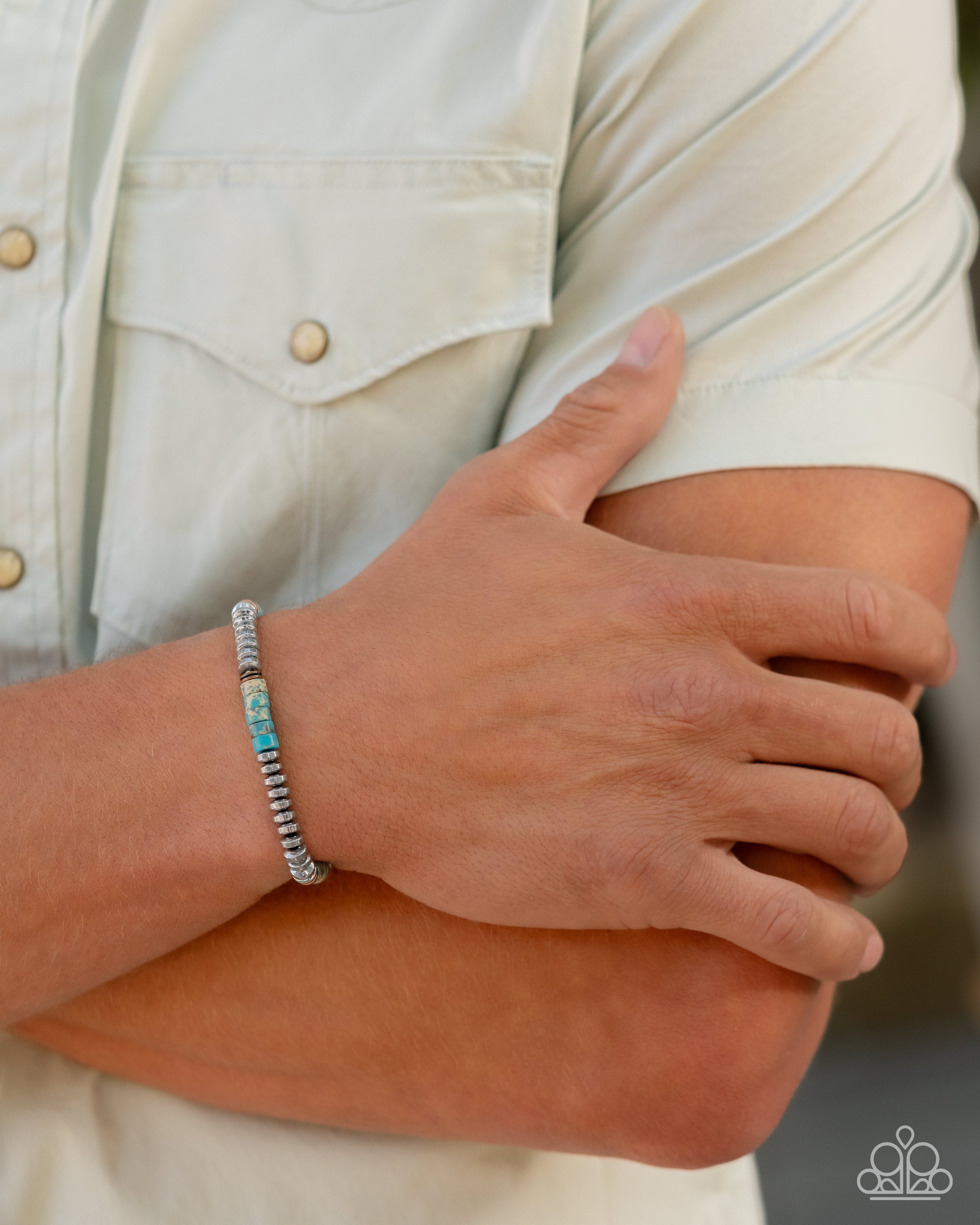 Infused along an elastic stretchy band, a collection of glistening silver discs alternates with sections of turquoise-marbled stone discs bordered by duos of glistening copper discs for a marbled medley along the wrist. As the stone elements in this piece are natural, some color variation is normal.