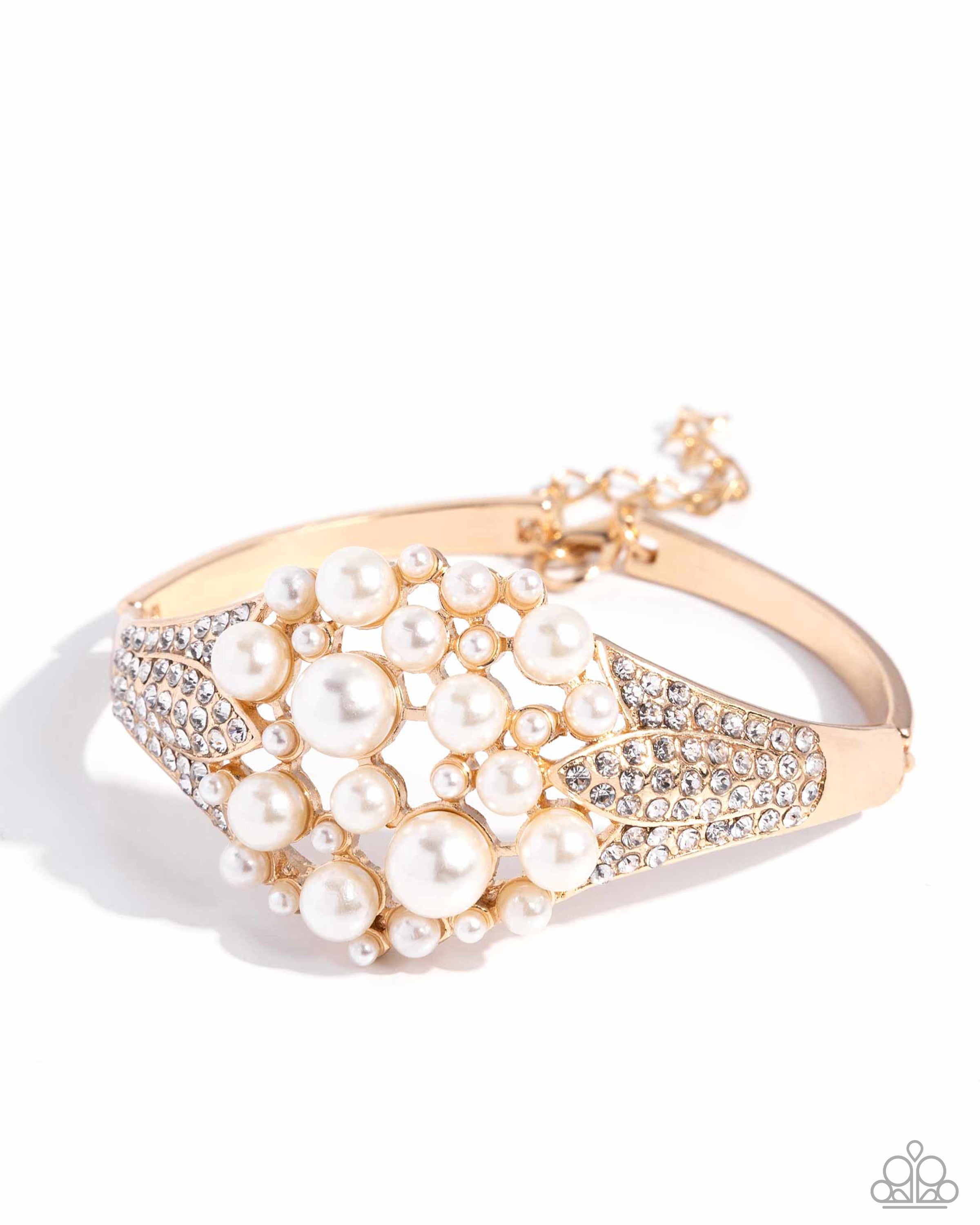 Bubbly white pearls scatter and stack atop the center of the wrist in a haphazard, gold-fitted pattern for a refined pendant. Attached to two arcing gold bars, row after row of glassy white rhinestones glitter from three-pronged gold petals, coalescing into an undeniably glamorous look. Features an adjustable clasp closure.