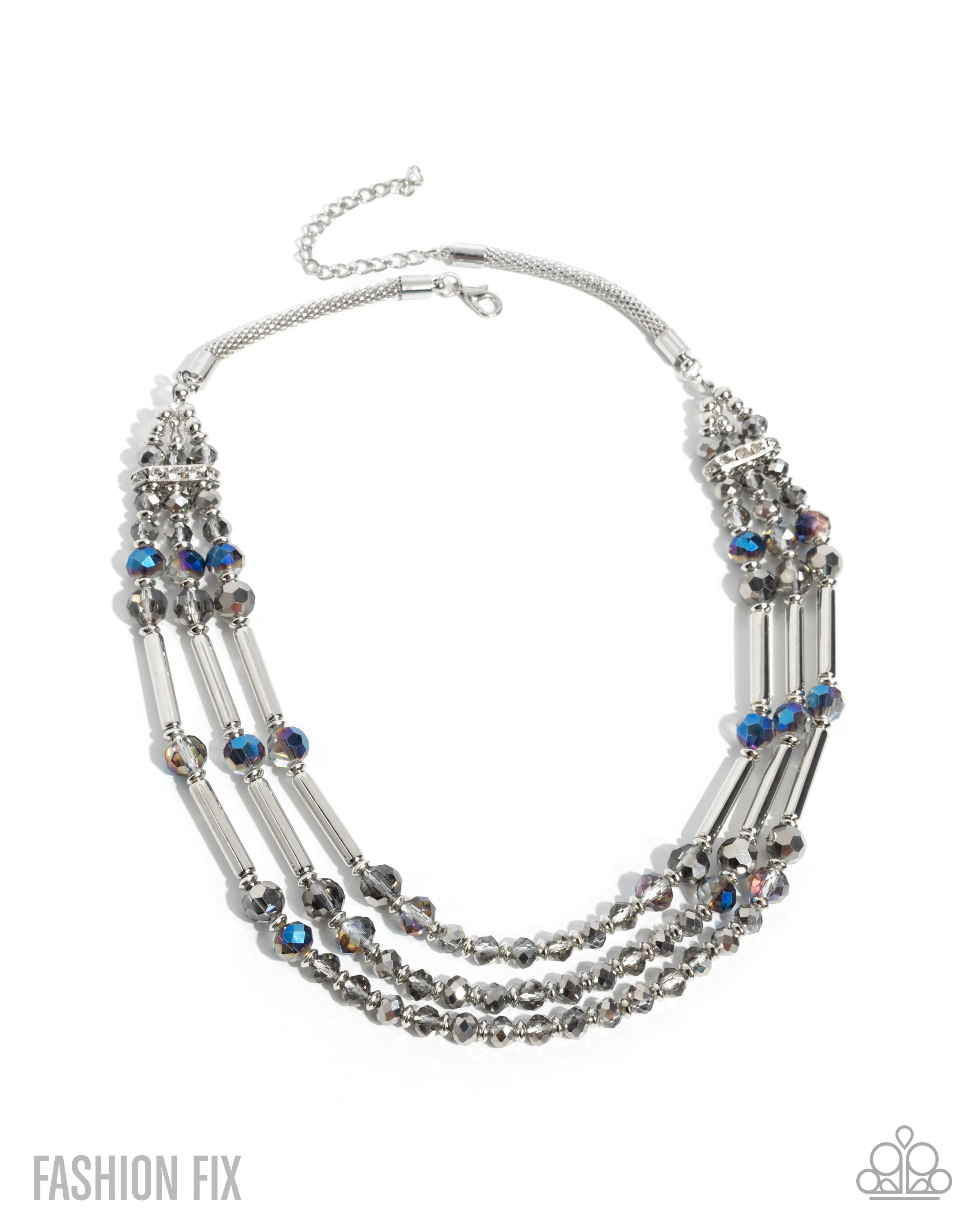 Brushed in a UV-shimmer, a seemingly flashy collection of faceted beads in varying hues, silver cylindrical beads, and silver discs stream in place along three invisible strings from a silver mesh chain, creating edgy layers across the chest. Features an adjustable clasp closure.