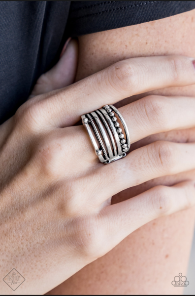 Featuring smooth, dotted, and textured finishes, mismatched silver bands layer across the finger for a bold industrial look. Features a stretchy band for a flexible fit.