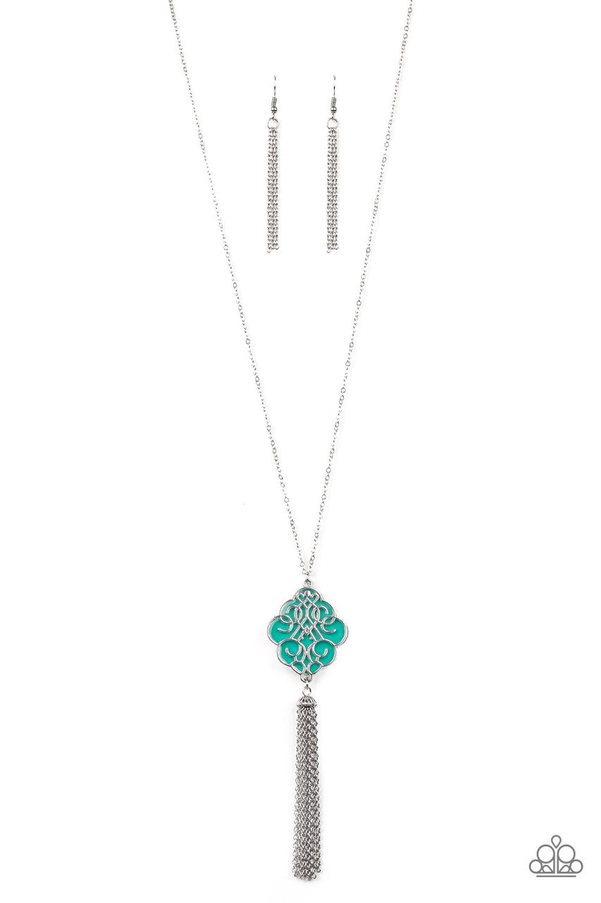 Shimmery silver filigree swirls across a shiny green backdrop, coalescing into a colorful pendant. A glistening silver chain tassel swings from the bottom of the pendant for a whimsical finish. Features an adjustable clasp closure.