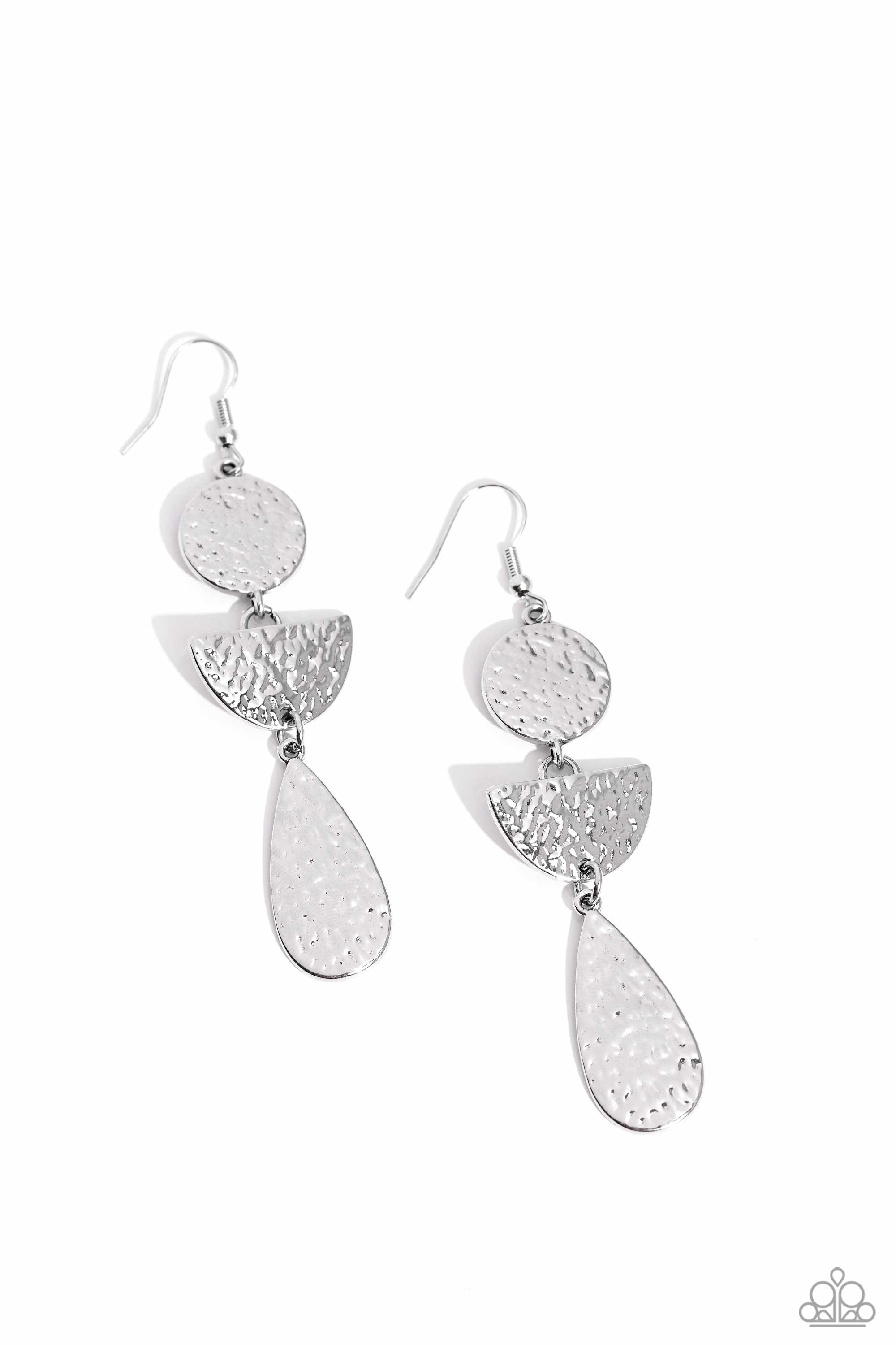 Delicately hammered in an antiqued shimmer, round, half moon, and teardrop silver frames delicately link into a rustic lure. Earring attaches to a standard fishhook fitting.