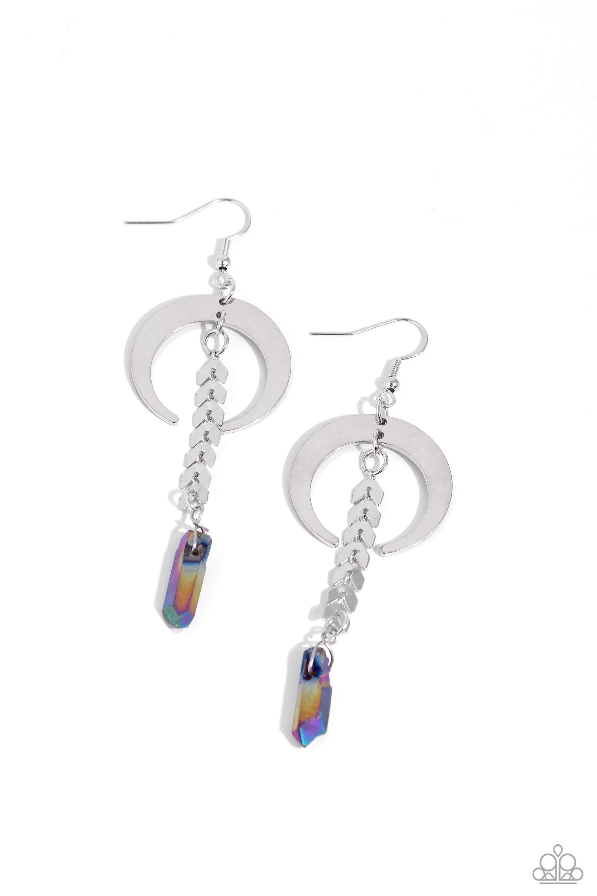Delicately cascading from a silver laurel chain, a chiseled oil spill dipped stone swings from the bottom of a shiny silver crescent-shaped hoop, creating a seasonal lure. Earring attaches to a standard fishhook fitting.