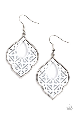 Thessaly Terrace - White - Painted Silver Filigree Floral Paparazzi Fishhook Earrings