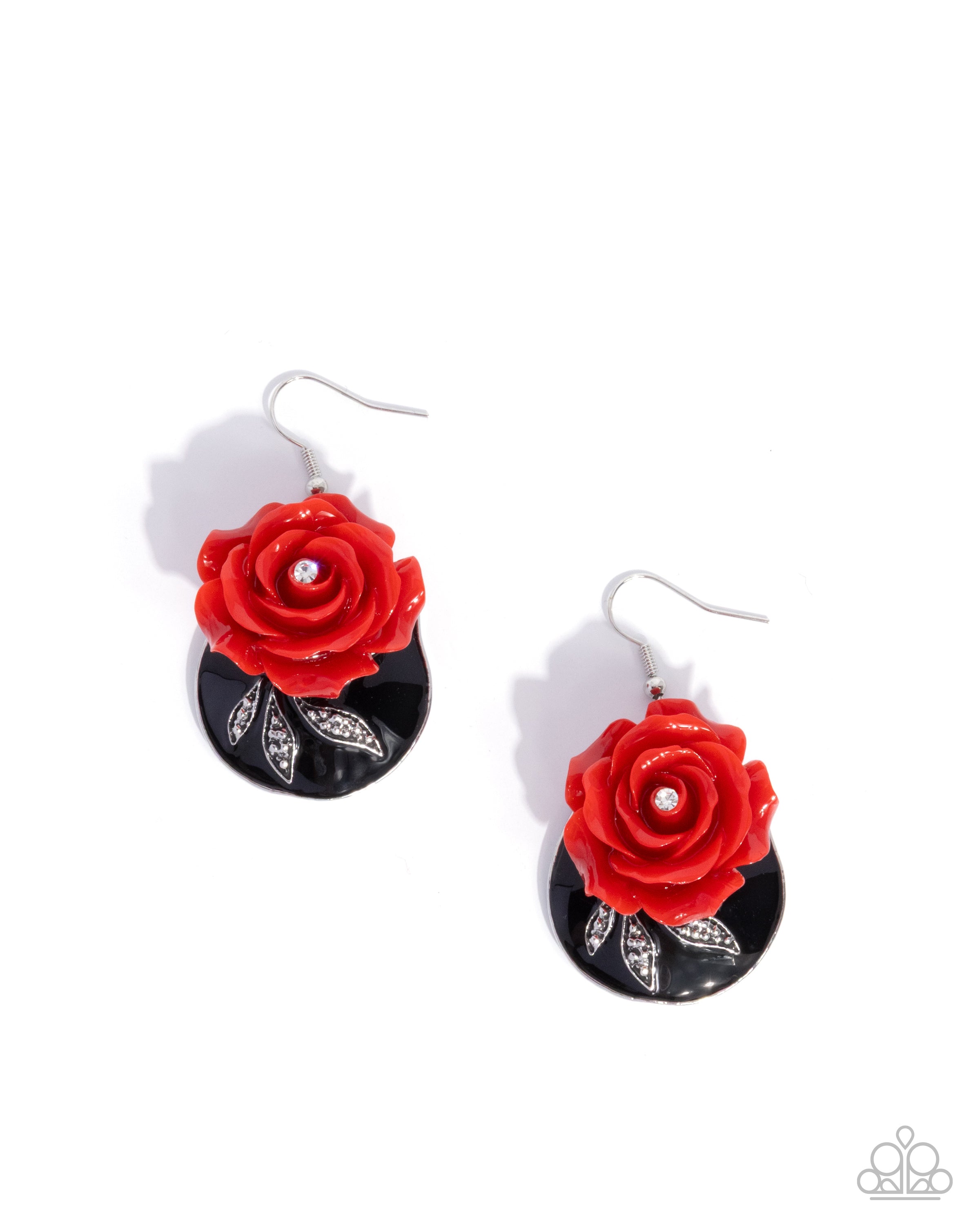 Featuring a solitaire white rhinestone centerpiece, three-dimensional glossy red rose petals bloom in front of a black-painted pendant complete with a trio of textured leaves for an over-the-top whimsical lure. Earring attaches to a standard fishhook fitting.
