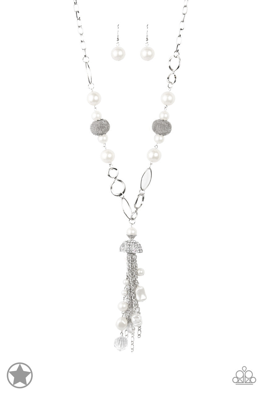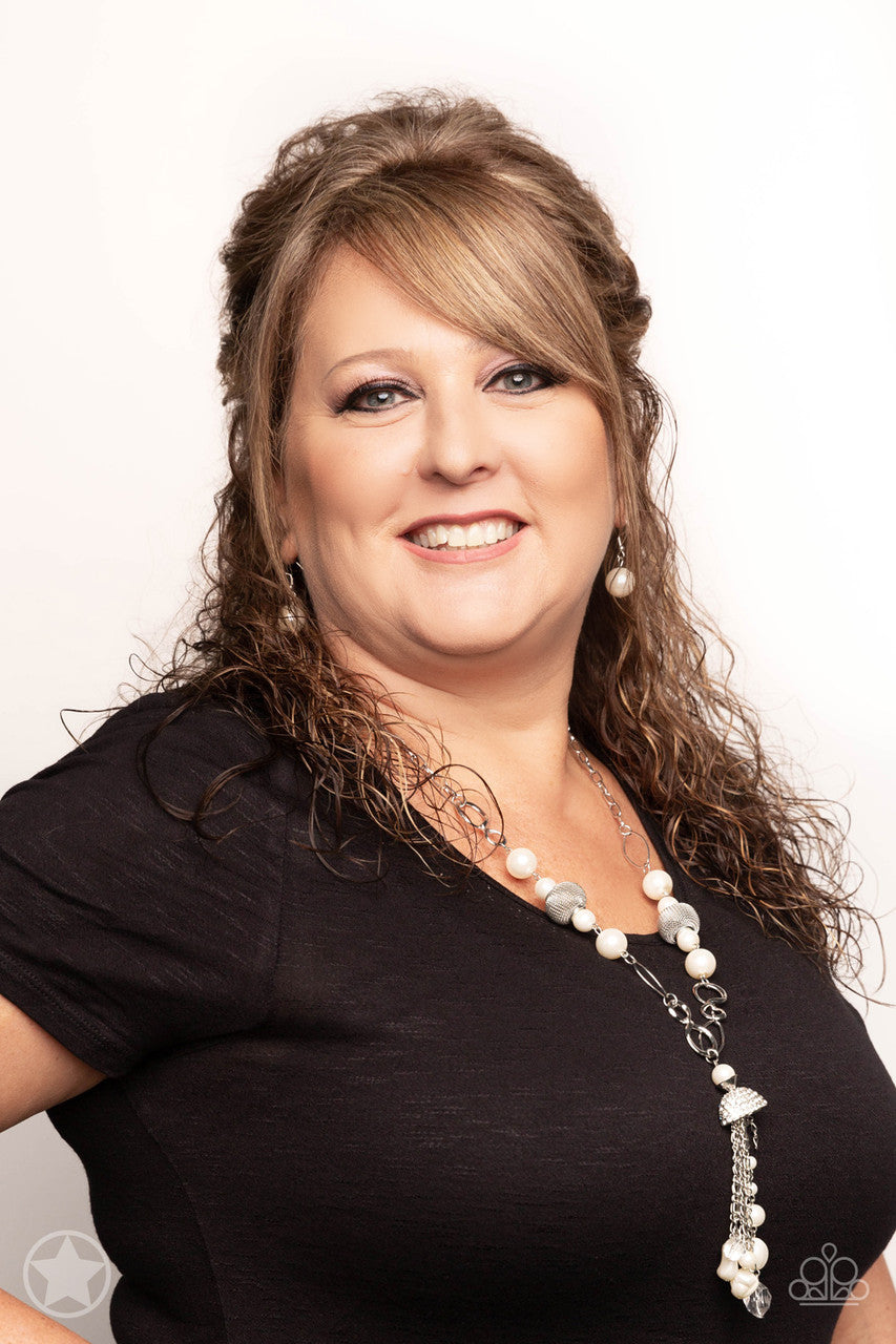 A half-shell studded in rhinestones overhangs a cluster of ivory pearls, tassels of silver chain, and small crystals. Two large wire mesh spheres and larger ivory pearls decorate the neckline.