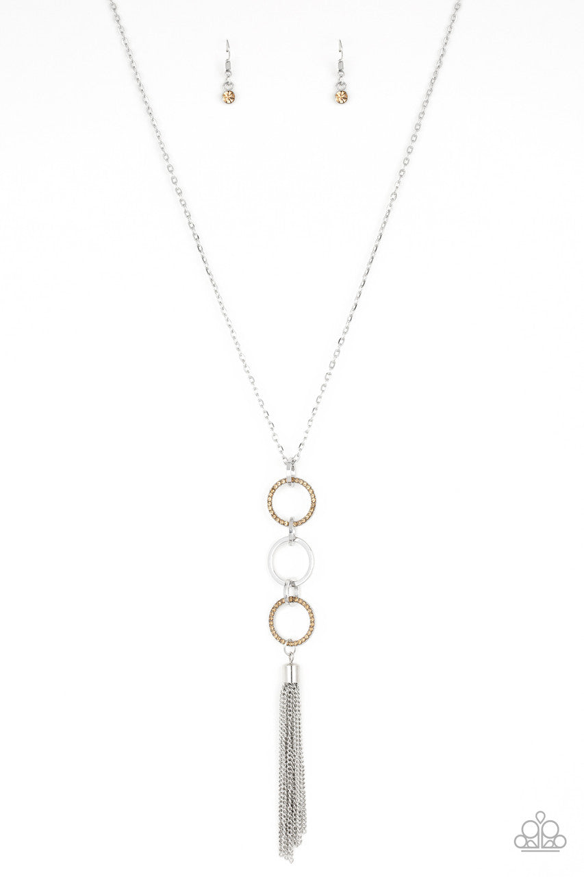 Glistening silver hoops and topaz rhinestone encrusted hoops connect at the bottom of a lengthened silver chain, creating a glittery stacked pendant. A shimmery silver tassel swings from the bottom for a flirty finish. Features an adjustable clasp closure.