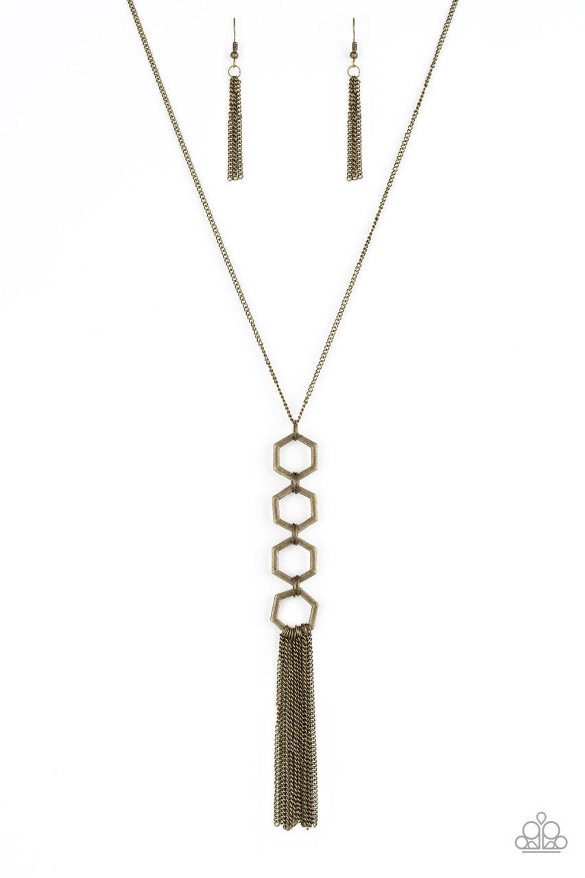 Four brass hexagon frames connect at the bottom of a lengthened brass chain, creating an edgy stacked pendant. A glistening brass tassel swings from the bottom of the geometric pendant, adding movement to the modern piece. Features an adjustable clasp closure.