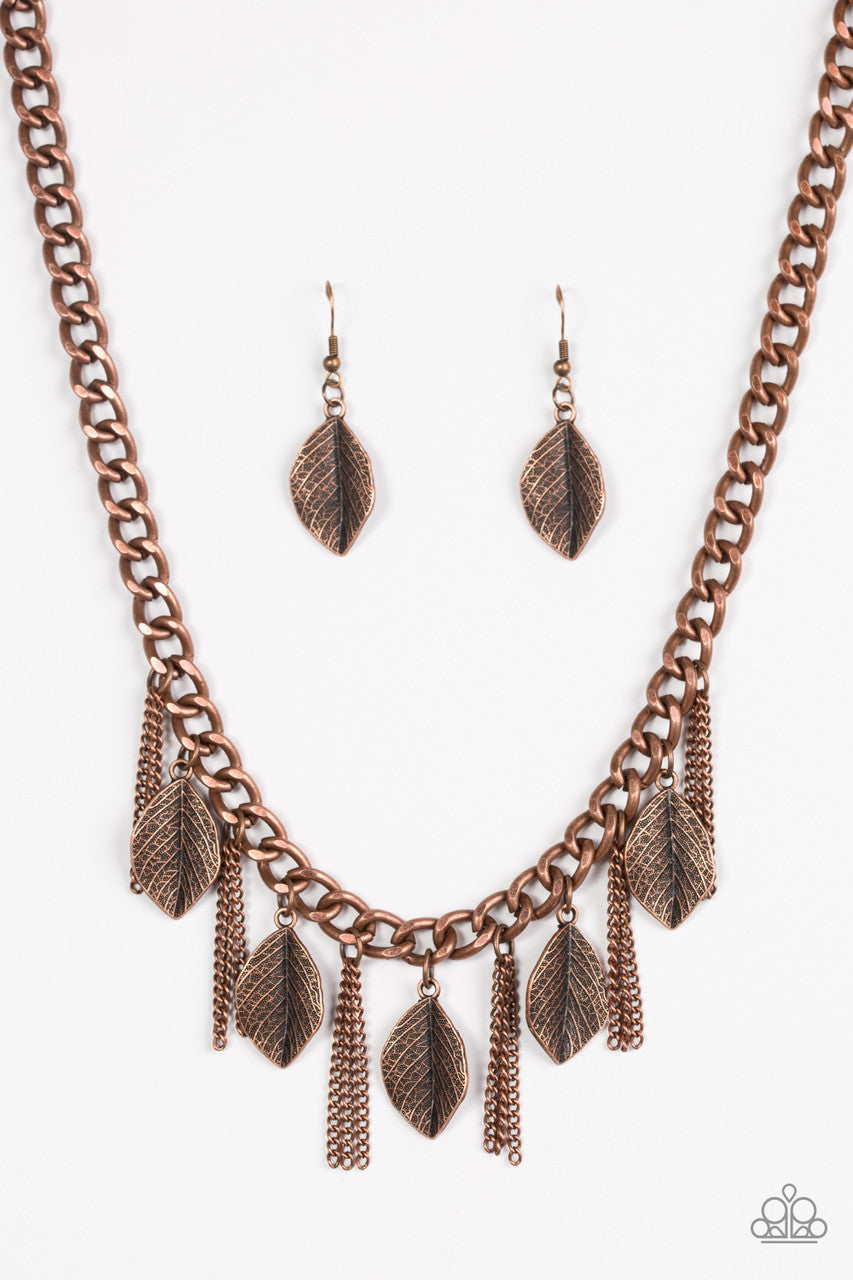 Decorated in lifelike textures, glistening copper leaves swing from the bottom of a bold copper chain. Infused with sections of copper chain tassels, the leafy fringe drapes below the collar for a seasonal look. Features an adjustable clasp closure.