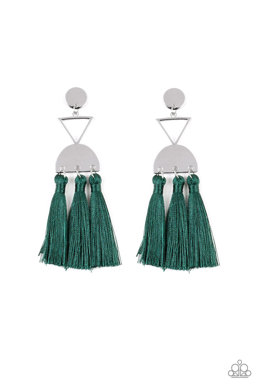 A shimmery silver disc, airy silver triangle, and shimmery half moon frame link into a geometric lure. Three green threaded tassels swing from the bottom of the stacked frame for a trendy finish. Earring attaches to a standard post fitting.
