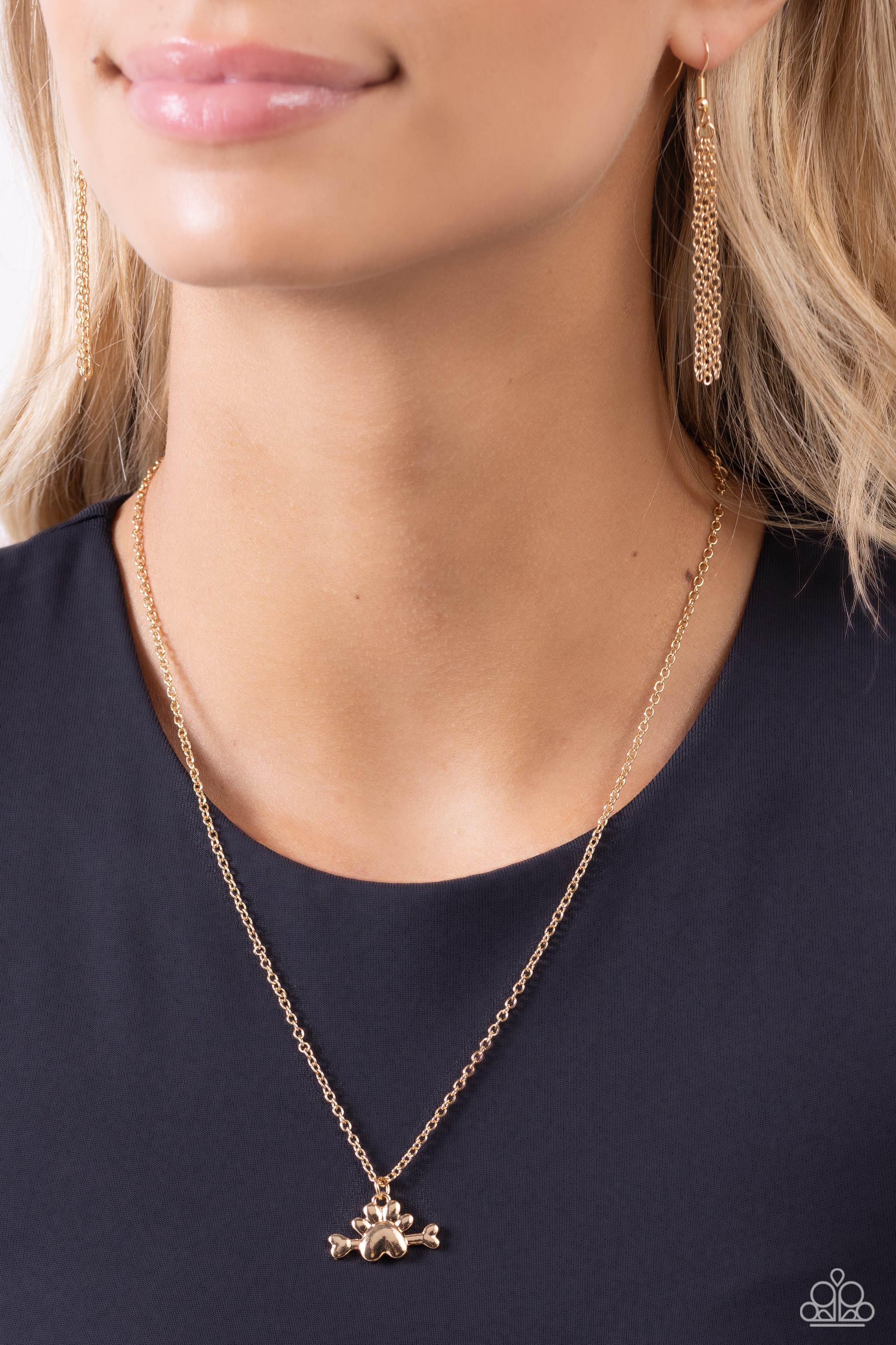 Infused through a sleek gold dog bone, a shiny gold paw print charm swings from a classic gold chain below the collar, creating a pet-lover inspired pendant. Features an adjustable clasp closure.