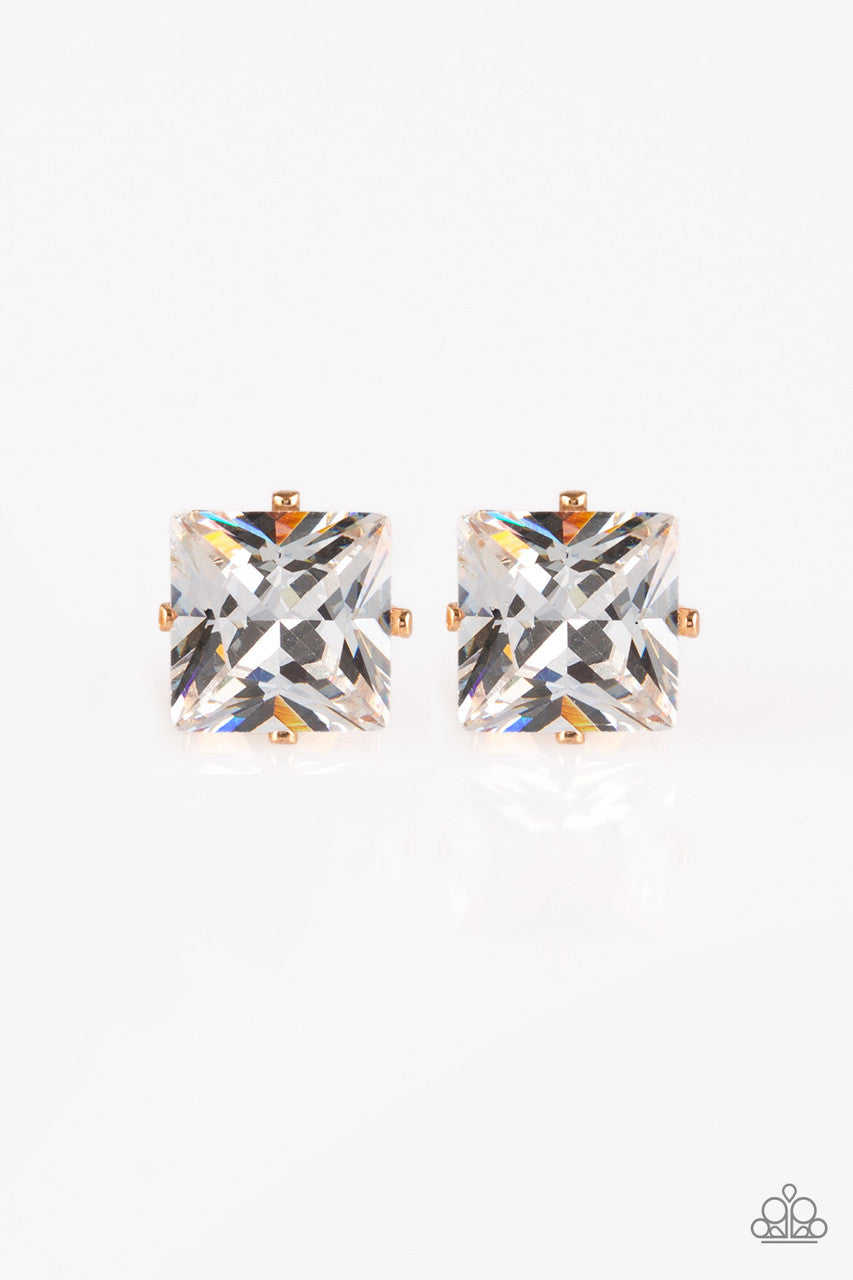 Featuring a regal princess style cut, an oversized white gem sits atop a classic gold frame in a dramatic finish. Earring attaches to a standard post fitting.