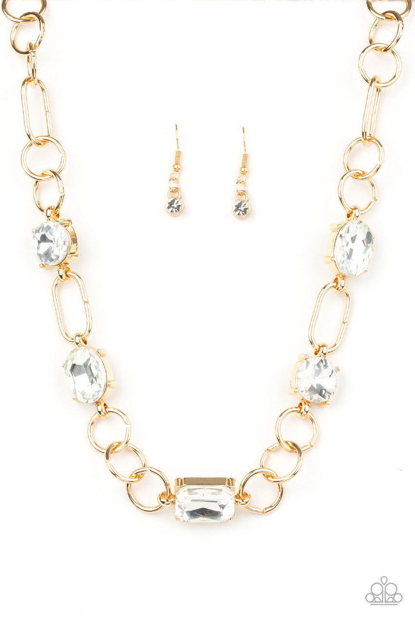 Featuring round, oval, and emerald style cuts, glittery white rhinestone fittings link with mismatched gold rings below the collar for an edgy glamorous look. Features an adjustable clasp closure.