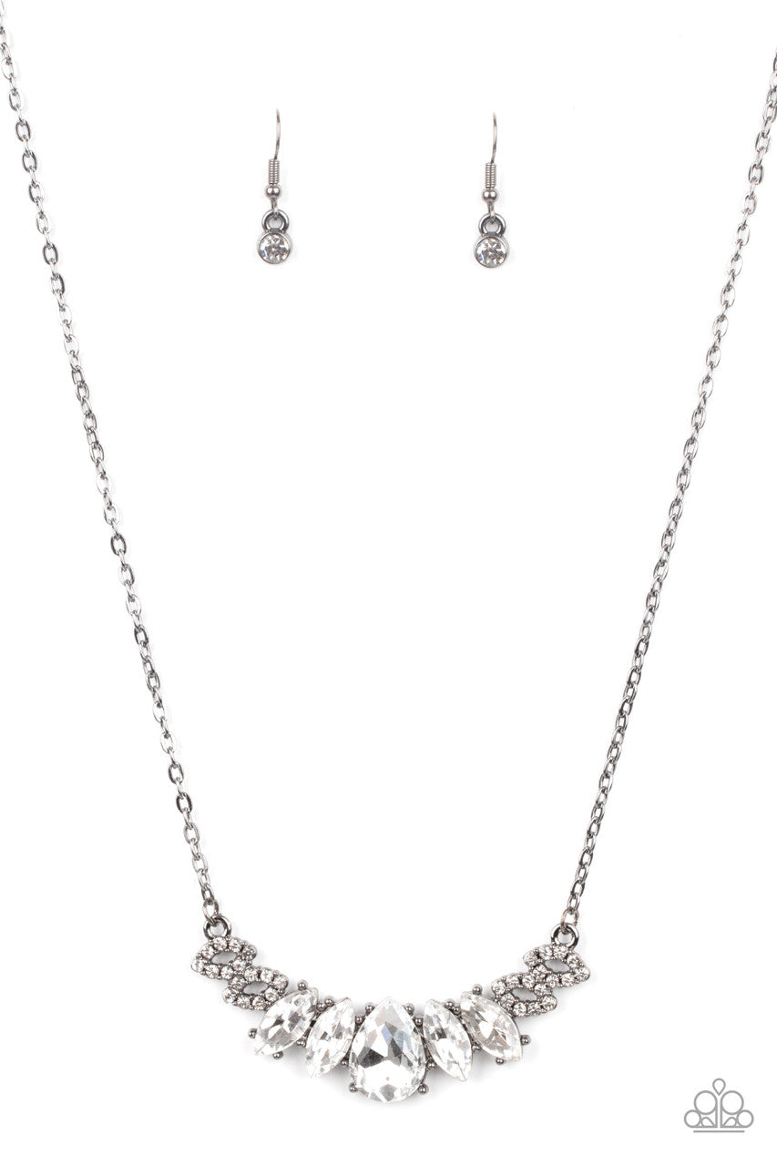 Featuring a dramatically oversized white teardrop rhinestone center, dainty white rhinestone encrusted gunmetal frames connect with pairs of glassy marquise cut rhinestones below the collar for a sparkly statement-making look. Features an adjustable clasp closure.