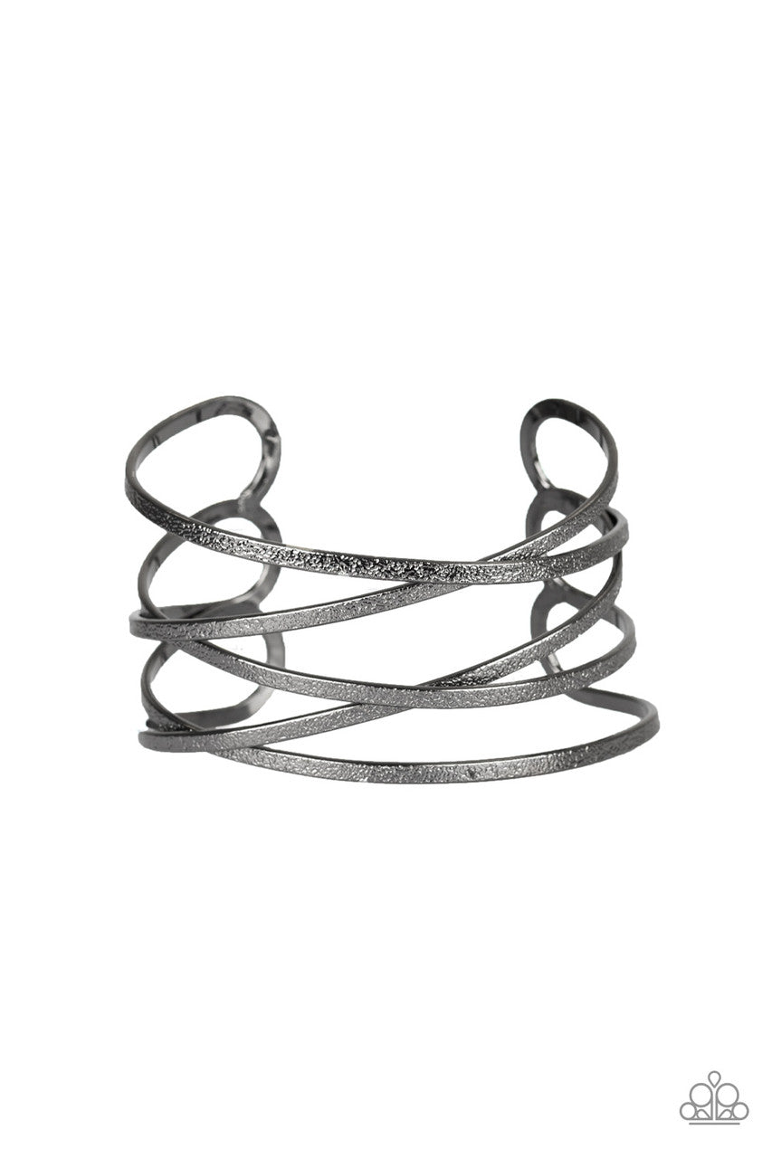 Delicately hammered in shimmery textures, glistening gunmetal ribbons crisscross across the wrist, coalescing into an airy cuff.
