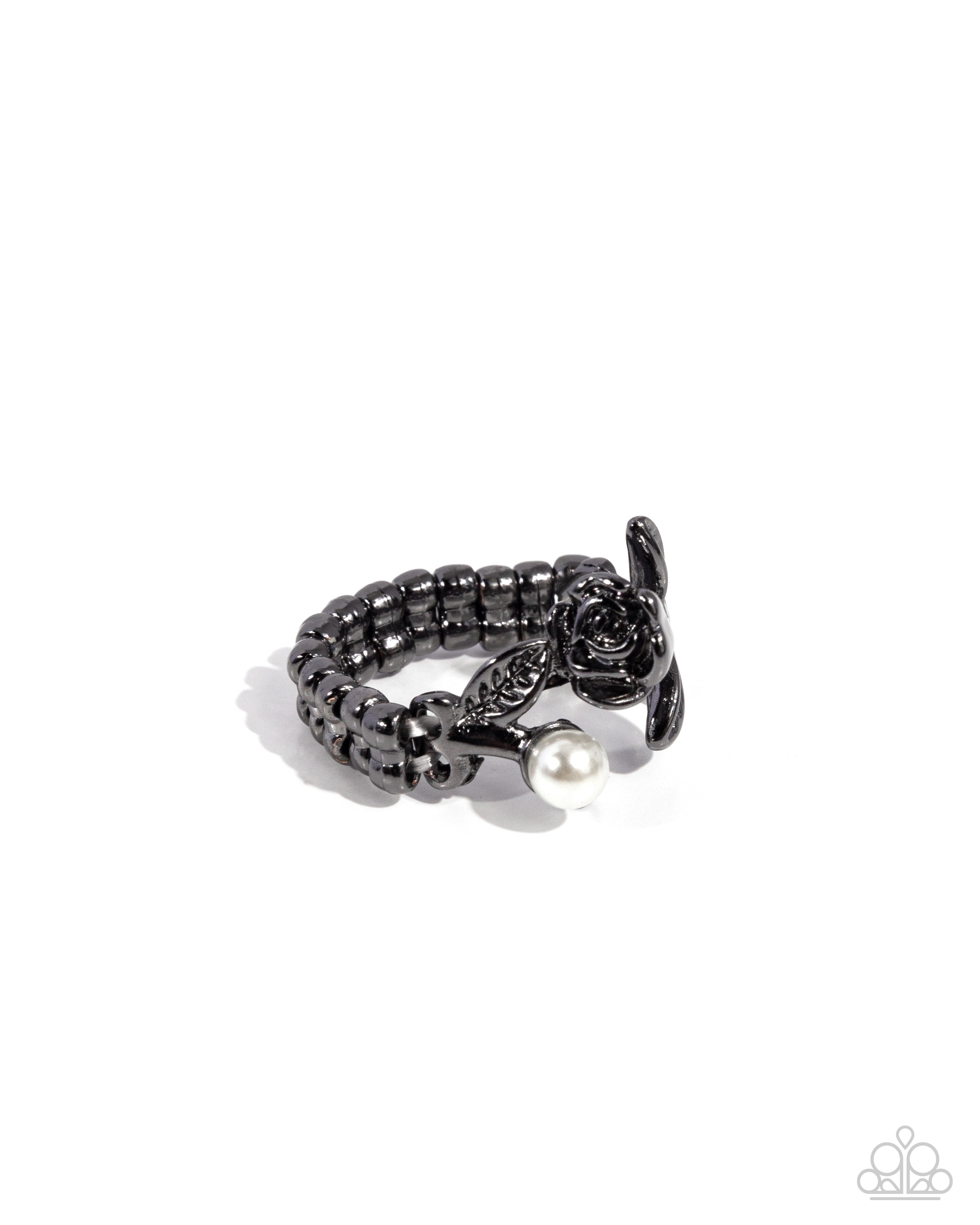 Blooming from the stem of a sleek gunmetal rose, a glossy white pearl curls around the finger for a whimsically refined centerpiece. Features a dainty stretchy band for a flexible fit.