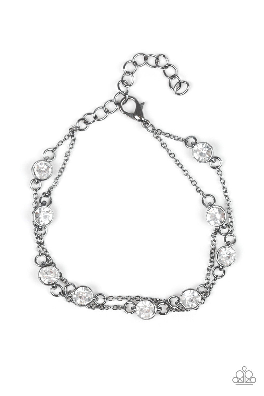 Featuring sleek gunmetal frames, glittery white rhinestones trickle along glistening gunmetal chains around the wrist for a refined fashion. Features an adjustable clasp closure.