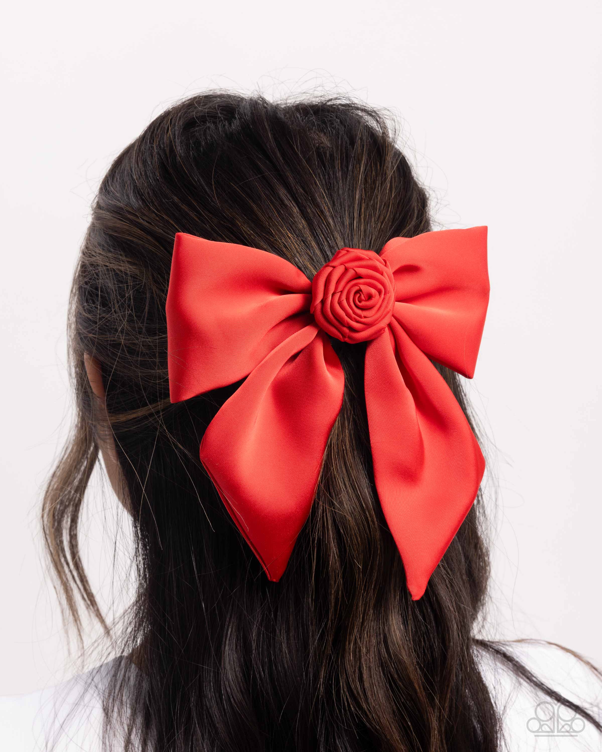 A silky red ribbon gracefully loops into an oversized bow, featuring cascading tails that exude sophistication. A matching red rosette nestles at the center of the bow, adding a soft floral touch. Features a standard hair clip on the back.
