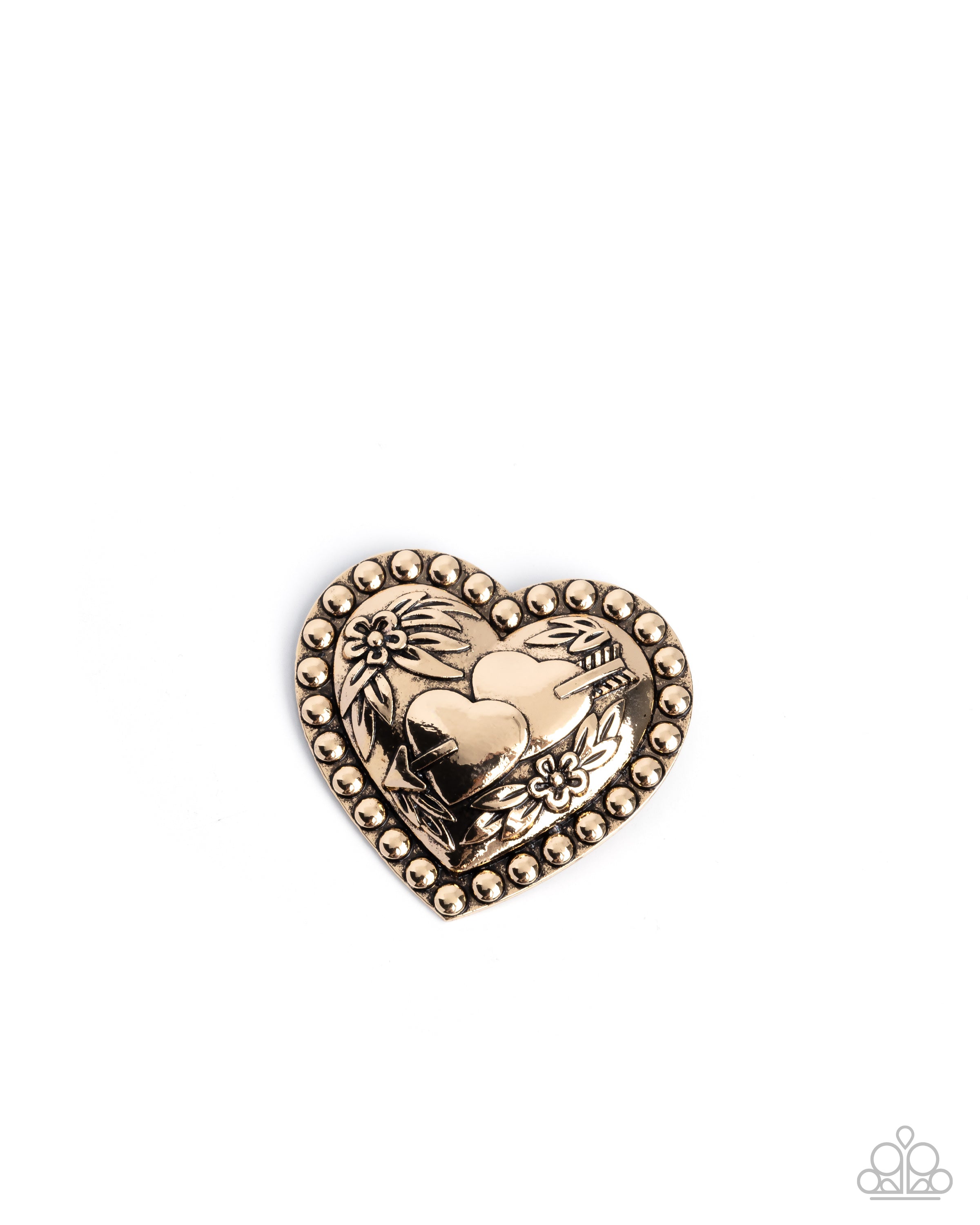 Embossed with antiqued gold flowers and a duo of antiqued gold hearts threaded with a cupid's arrow, an antiqued gold stud-bordered heart stands out as a romantic centerpiece. Brooch measures approximately 2" in length and 2 1/4" in width.