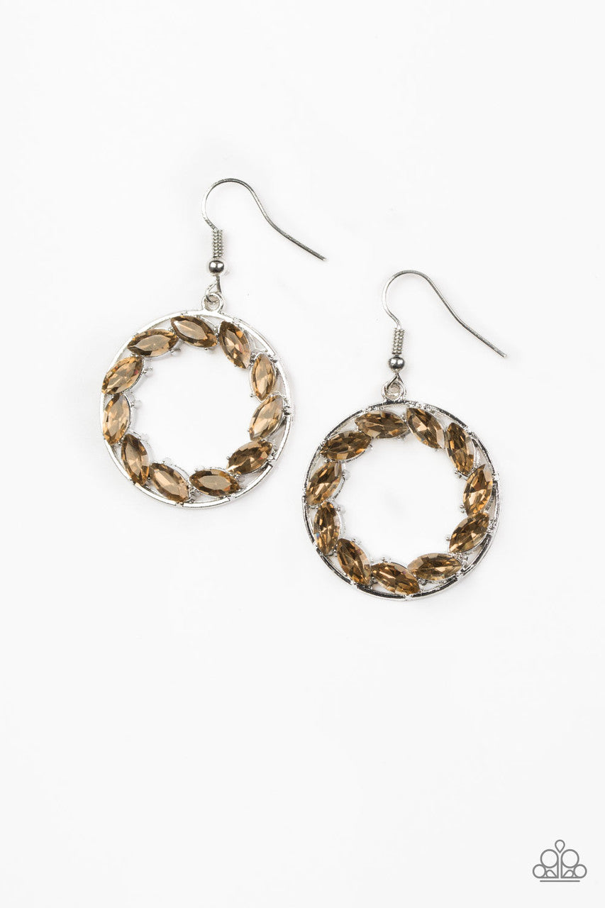 Featuring regal marquise style cuts, glittery topaz rhinestones are encrusted along a shimmery silver hoop for a radiant fashion. Earring attaches to a standard fishhook fitting.