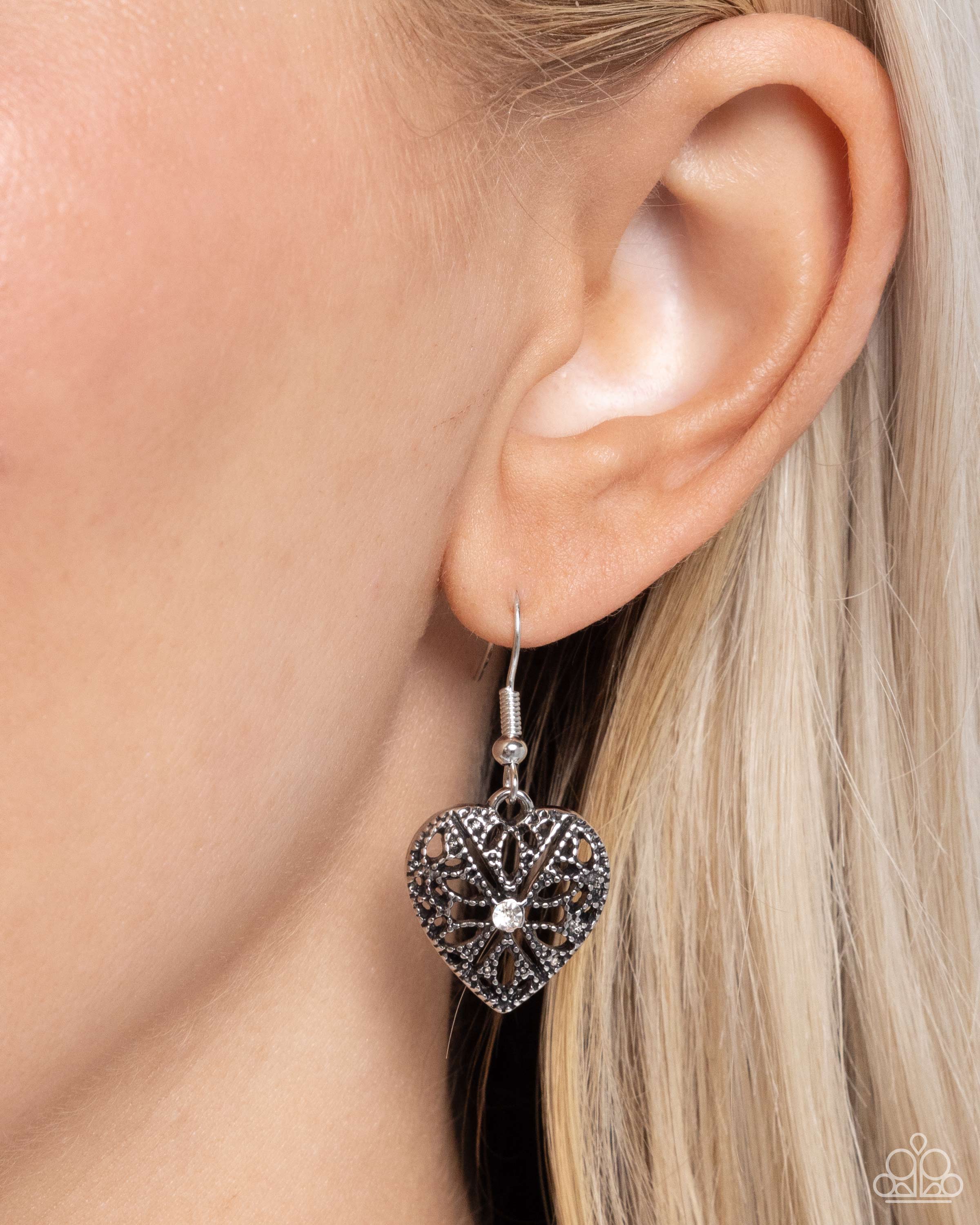 Stamped in swirly heart details, various silver hearts dance along a classic silver chain attached to a sleek silver ring, knotted at the bottom of an elongated silver chain, creating a romantically rustic sensation. A silver lobster clasp hangs from the bottom of the design to allow a name badge or other item to be attached. Features an adjustable clasp closure.