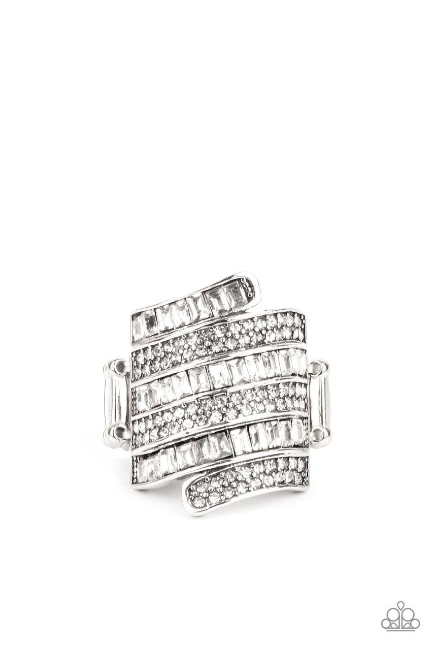 Dotted with pairs of dainty white rhinestones and glassy emerald cut rhinestones, stacks of silver bands wrap across the front of the finger for a jaw-dropping dazzle. Features a stretchy band for a flexible fit.