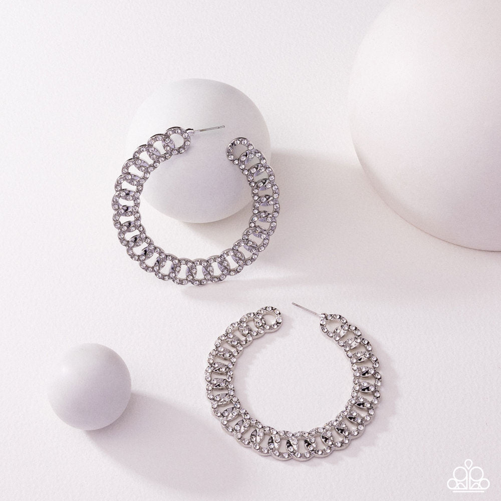Glittery white rhinestones are encrusted along the front of an interlocked oversized silver curb chain hoop for a shimmery sassy finish. Earring attaches to a standard post fitting. Hoop measures 2 1/2" in diameter.