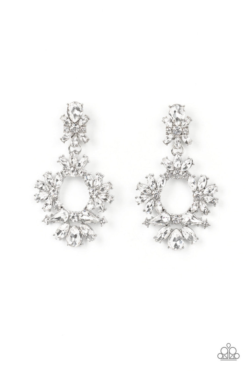 Ablaze with a mismatched assortment of brilliant white rhinestones, a stunning wreath swings from the bottom of a dainty white rhinestone fitting for a jaw-dropping dazzle. Earring attaches to a standard post fitting.
