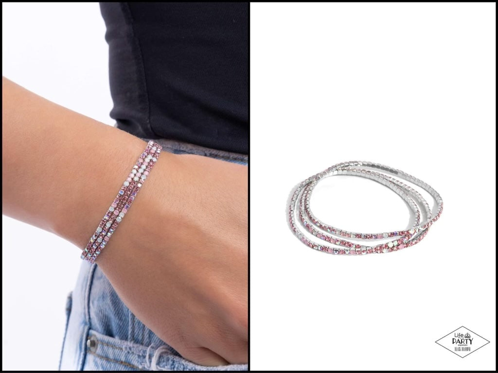 Featuring classic and opalescent finishes, a collection of dainty pink and white rhinestones are threaded along stretchy bands, creating glittery layers across the wrist.