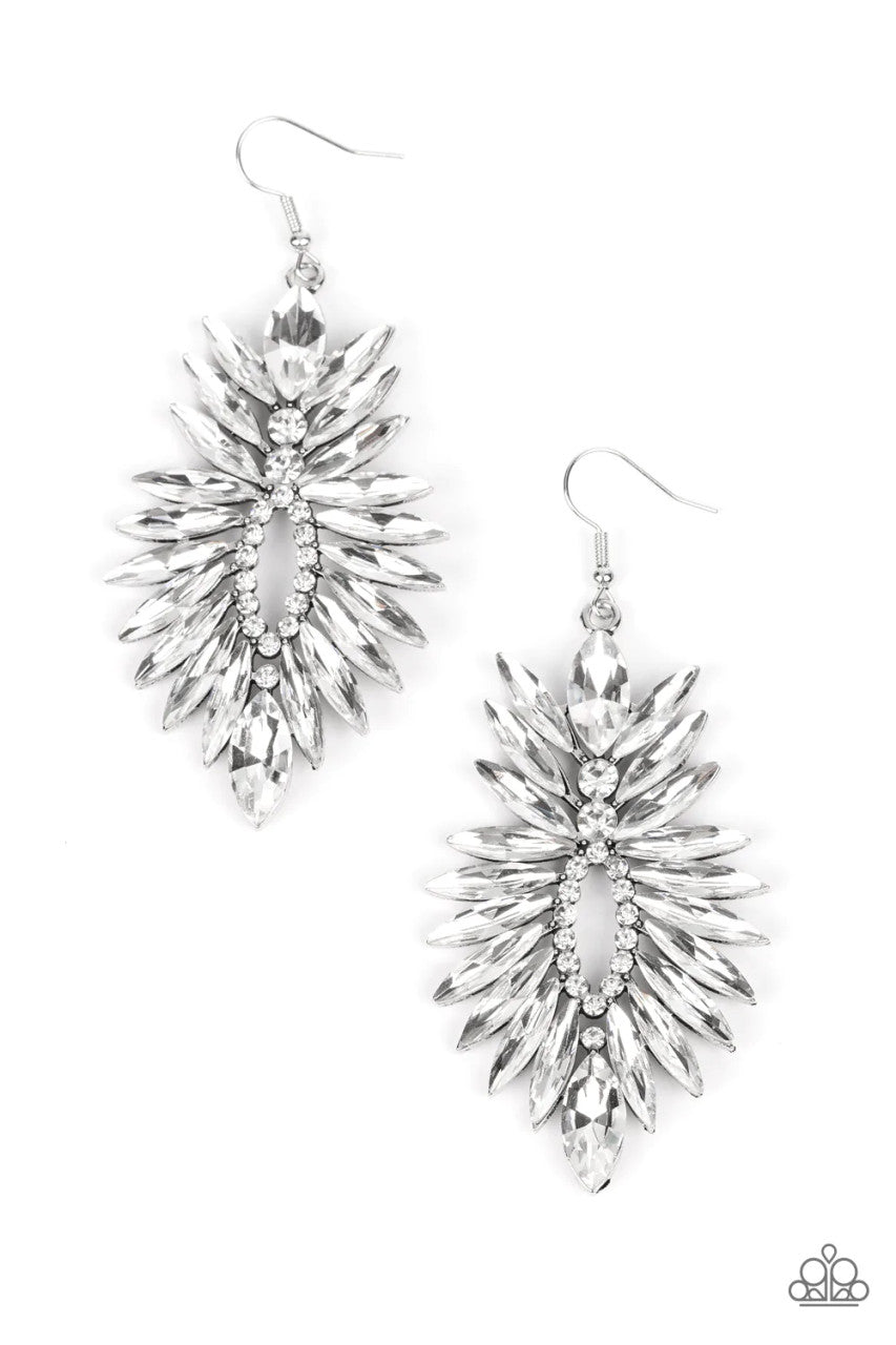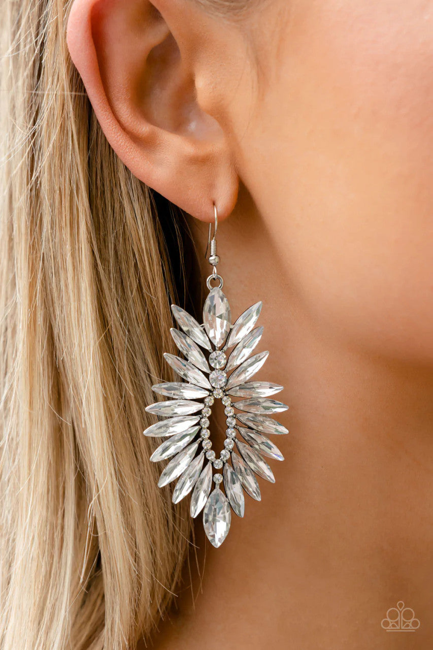 An explosion of white marquise rhinestones flares out from a ring of dainty white rhinestones, coalescing into an irresistibly icy statement piece. Earring attaches to a standard fishhook fitting.