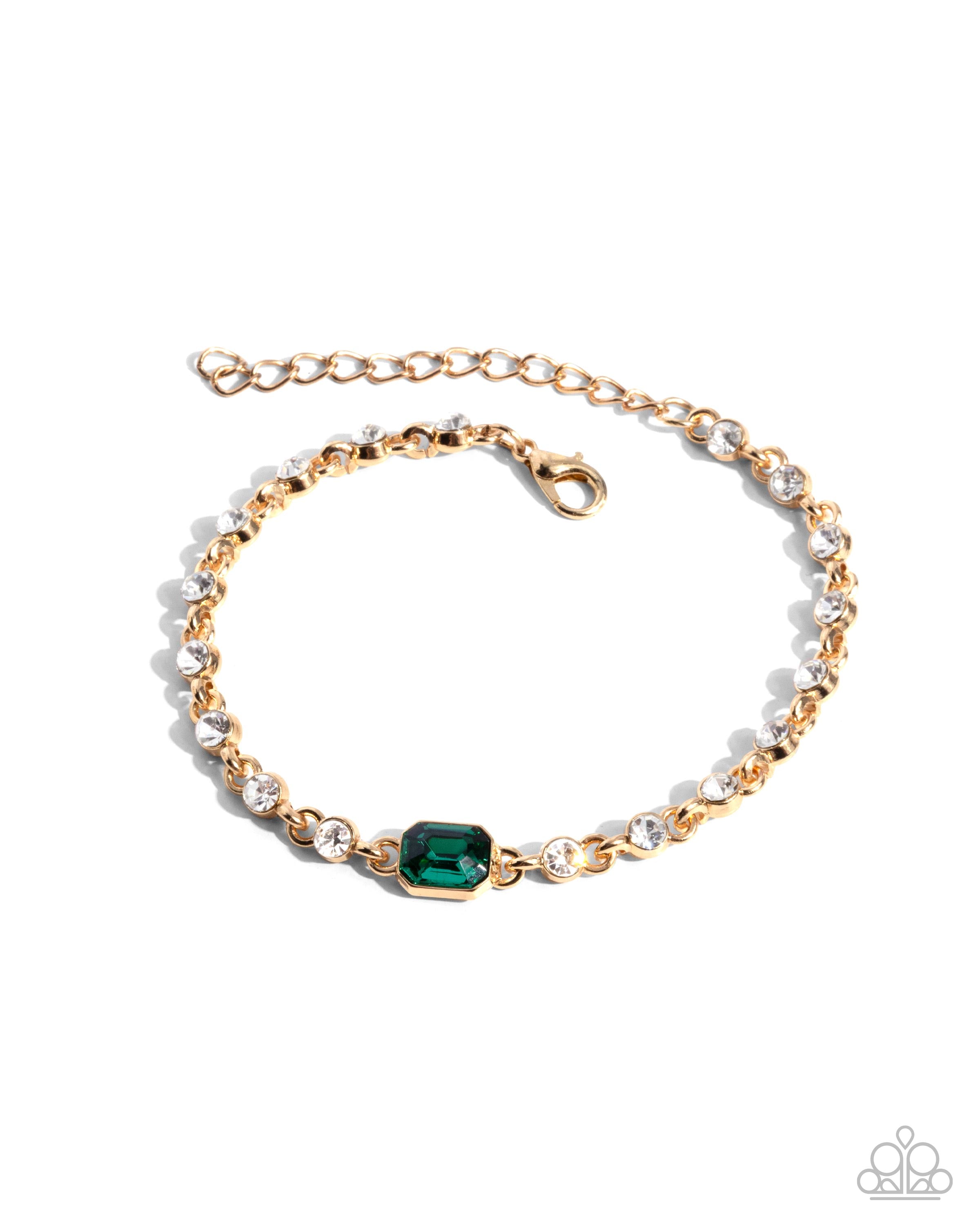 Pressed in bubbly gold fittings, white gems glisten along the wrist for a shimmery statement. Featured in the center of the design, an emerald, emerald-cut gem, also pressed in a gold fitting, reflects light in every direction for an attention-grabbing look. Features an adjustable clasp closure.