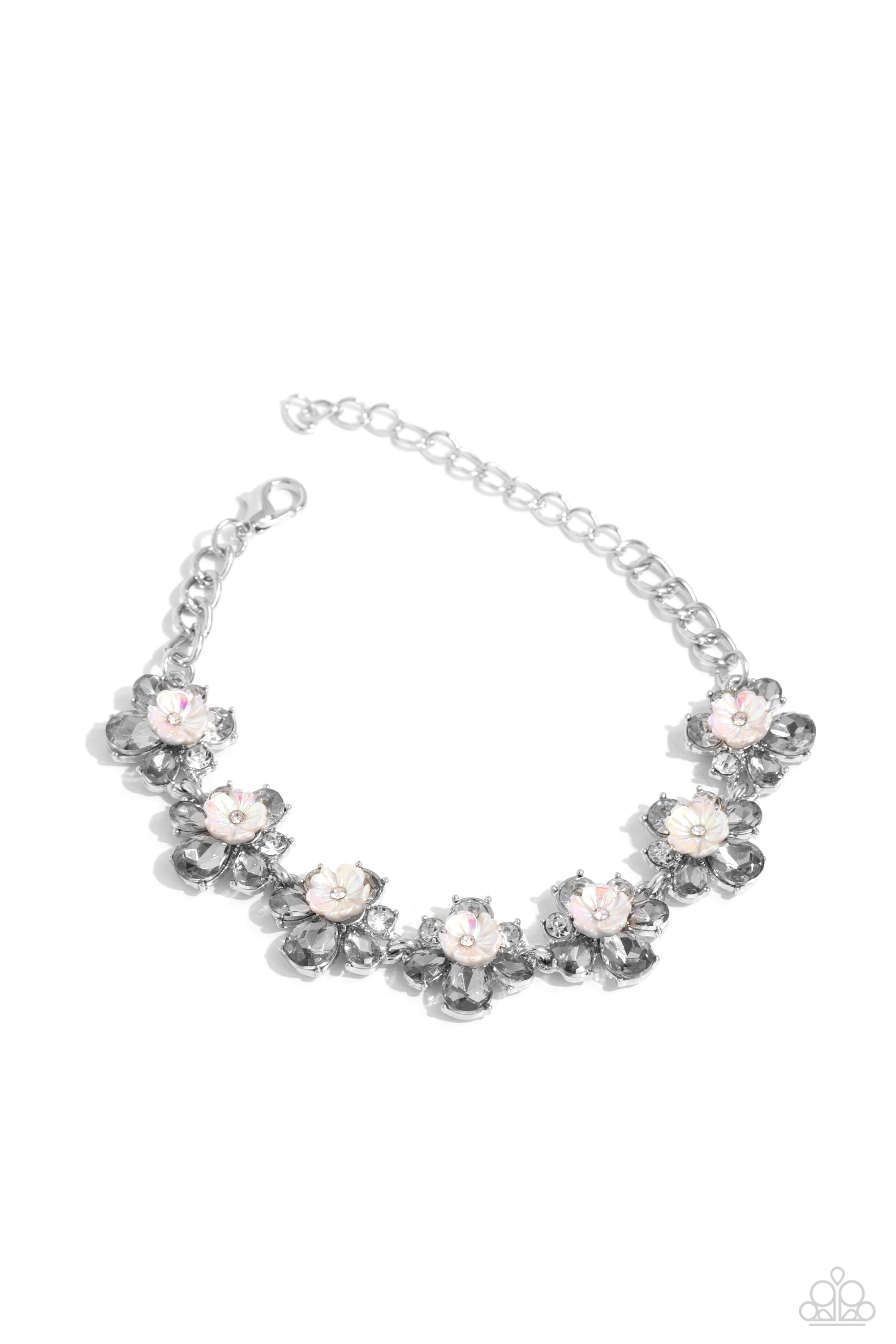 Dotted with white flower centers featuring an iridescent sheen and dainty silver studs, pronged round white and teardrop smoky petals create a dazzling display of floral centerpieces that link around the wrist for a seasonal look. Features an adjustable clasp closure. Due to its prismatic palette, color may vary.