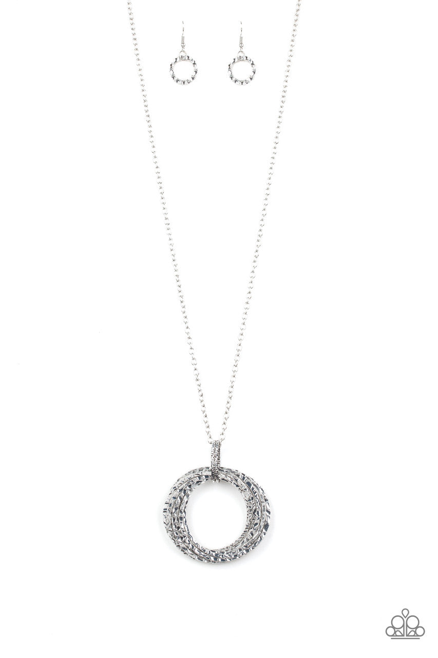 Featuring a hammered finish, a collection of interlocking silver hoops are threaded through the center of textured silver fittings. The dizzying pendant swings from the bottom of a lengthened silver chain for a dramatic industrial look. Features an adjustable clasp closure.